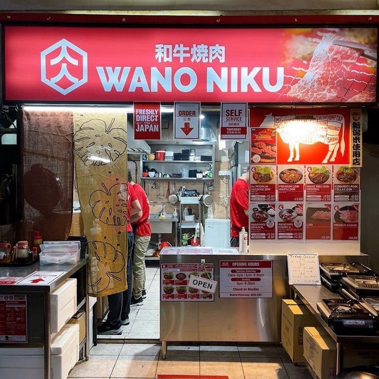 Wano Niku is a Japanese-owned hawker stall with outlets in Tanjong Pagar and Ang Mo Kio serving 100% A4 Japanese wagyu and Kumamoto pork directly imported from Japan. There are three flavours of signature yakiniku (a mix of karubi and loin) to choose from: Original, AKA (spicy), and Shiro (salt), all of which are priced at S$9 for 100g.