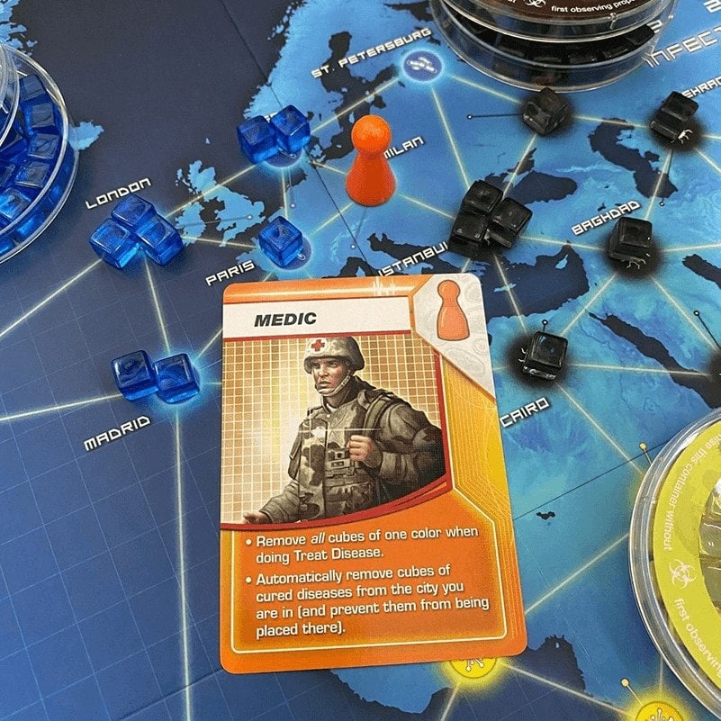 On each turn, a player can use up to four actions to travel between cities, treat infected populaces, discover a cure, or build a research station. Taking a unique role within the team, players must plan their strategy to mesh with their specialists’ strengths to conquer the diseases.