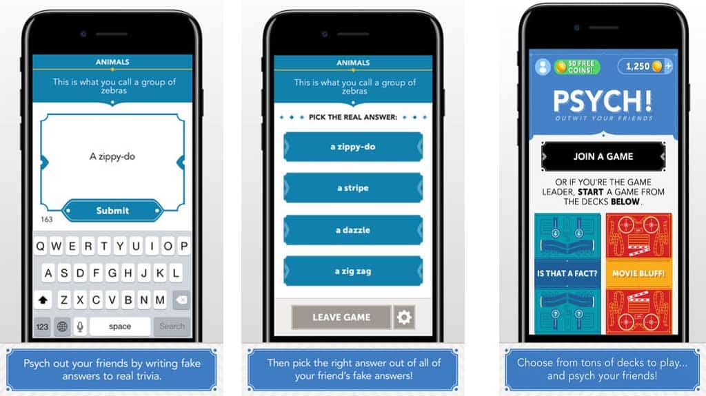 Psych! – This is a game where you try to outwit your friends. The game starts by asking a question. All players have to key in an answer that is wrong, but seemingly convincing. Within these answers, one of them is the correct answer. Every player will have to pick what they think is the correct answer. If you get the wrong answer, you’ll see who was the sneaky champ who fooled you. Psych your friends or pick the correct answers to win points.