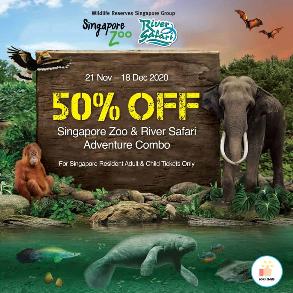 Enjoy 50% off Singapore Zoo & River Safari Adventure Combo tickets for visits from 21 November to 18 December 2020. The promotion is valid for Singapore residents adult and child tickets on same day admission only.