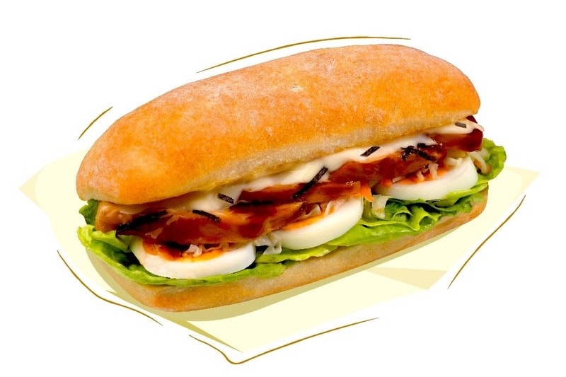 With slices of roasted chicken breast, teriyaki sauce, shredded pickled cabbage, seaweed flakes, baby romaine lettuce, and hard-boiled egg, the sandwich puts a Japanese twist on an otherwise Western snack.