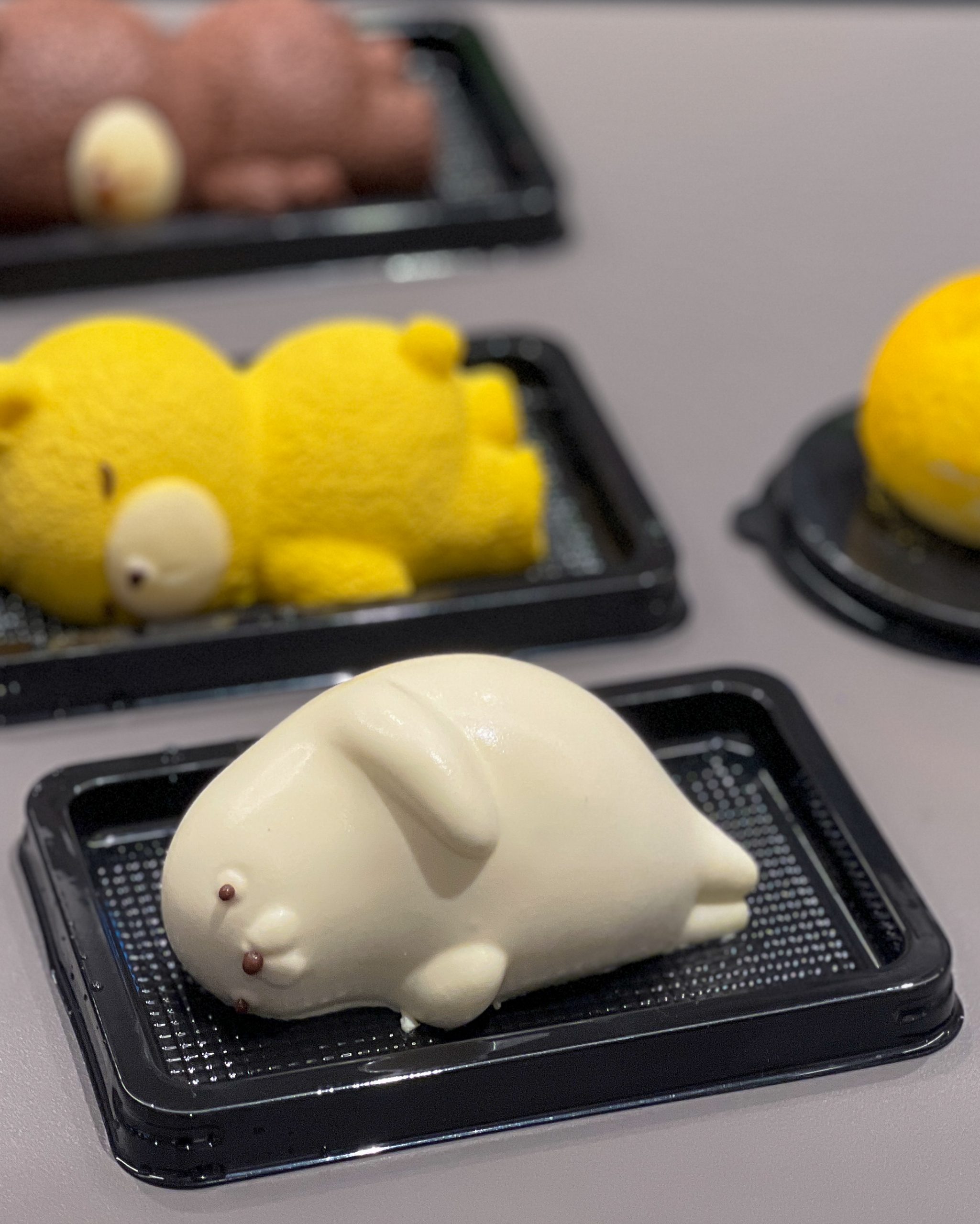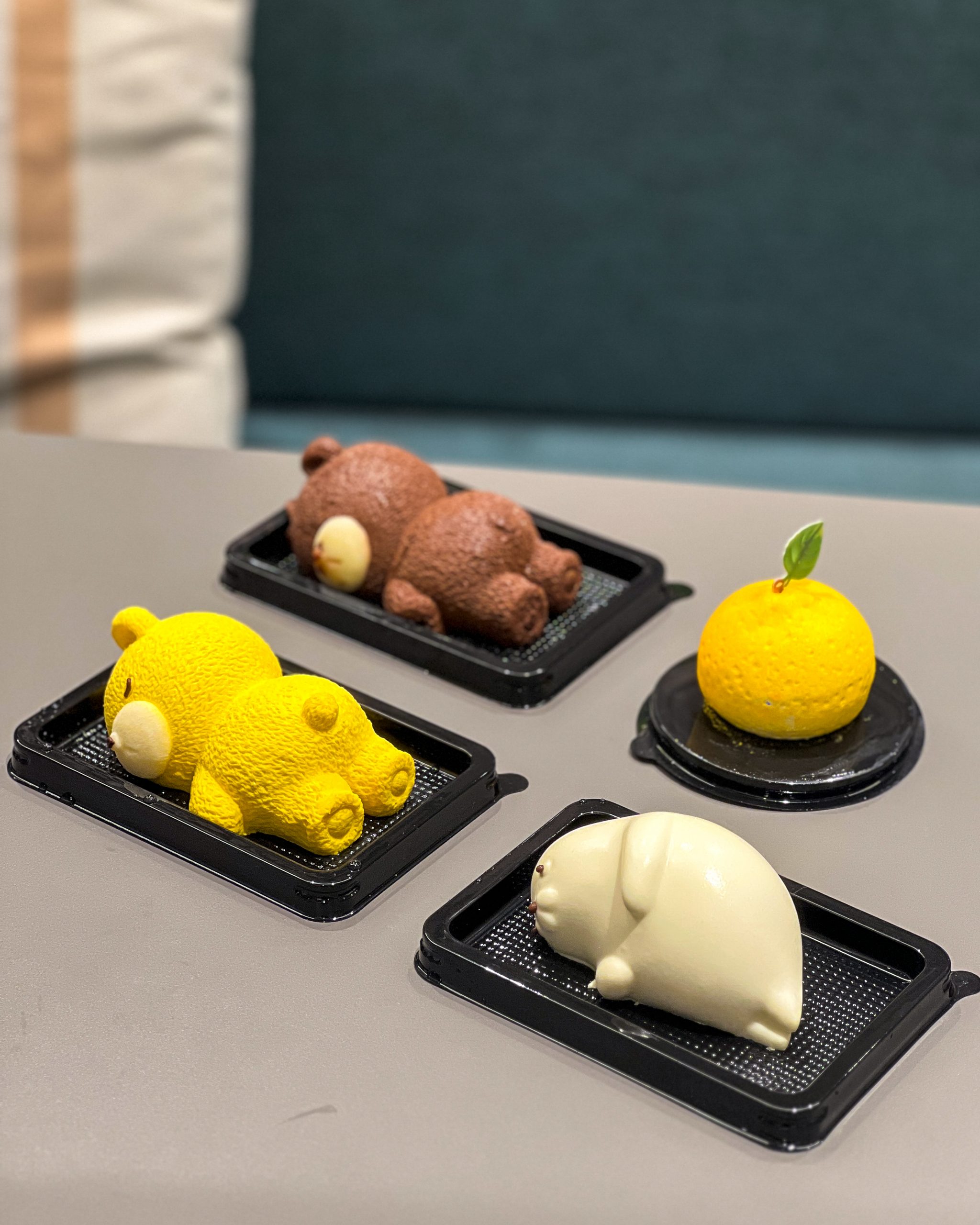 You’ve got absolutely adorable cakes shaped like teddy bears and a seal, all sleeping on their side, as well as a realistic-looking yuzu fruit.
