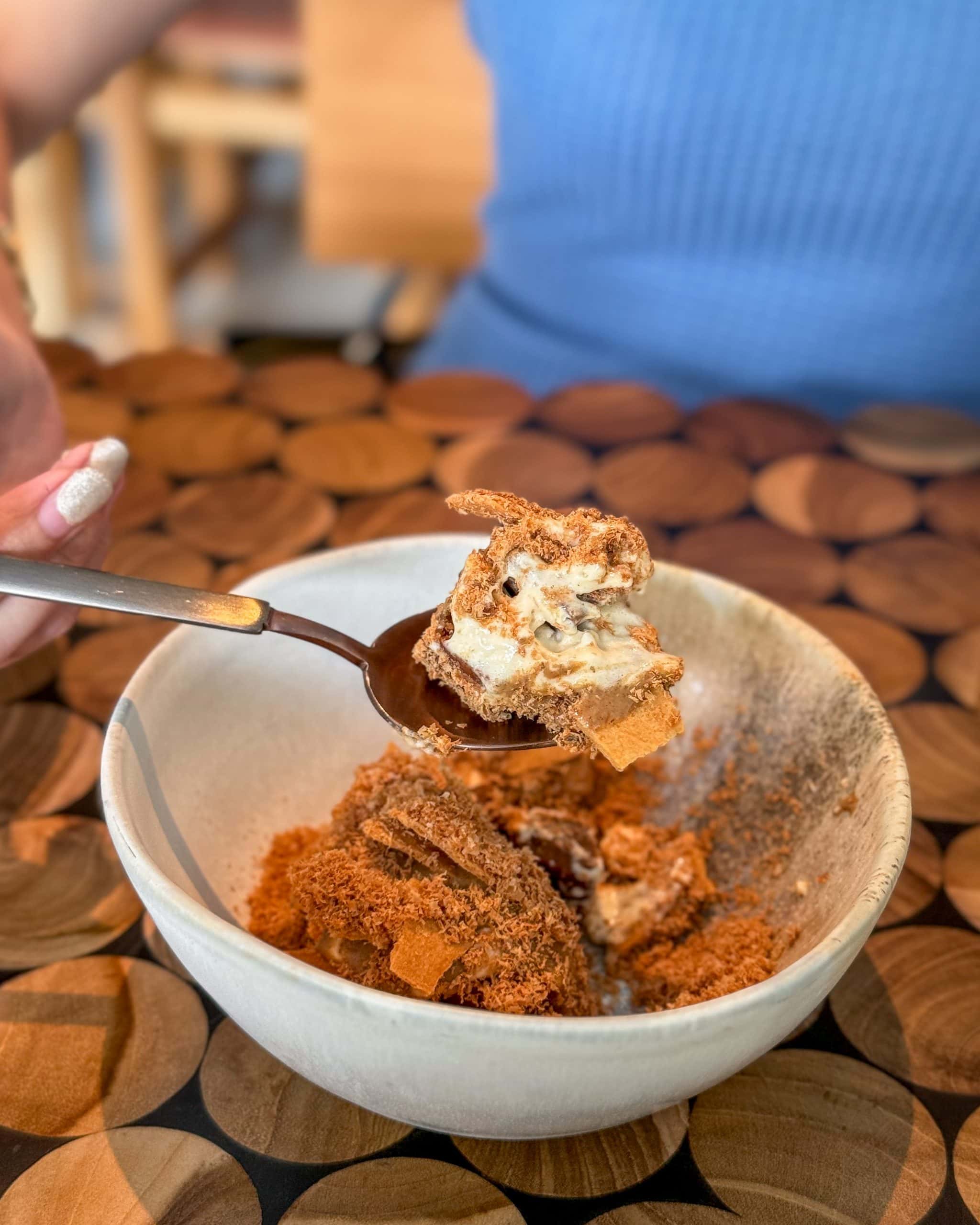 Sure enough, I was blown away by every single element, from the base of dense and fudgy brownies topped with banana skin caramel, to the whisky and cascara mousse, finished off with frozen “chocolate” shavings.