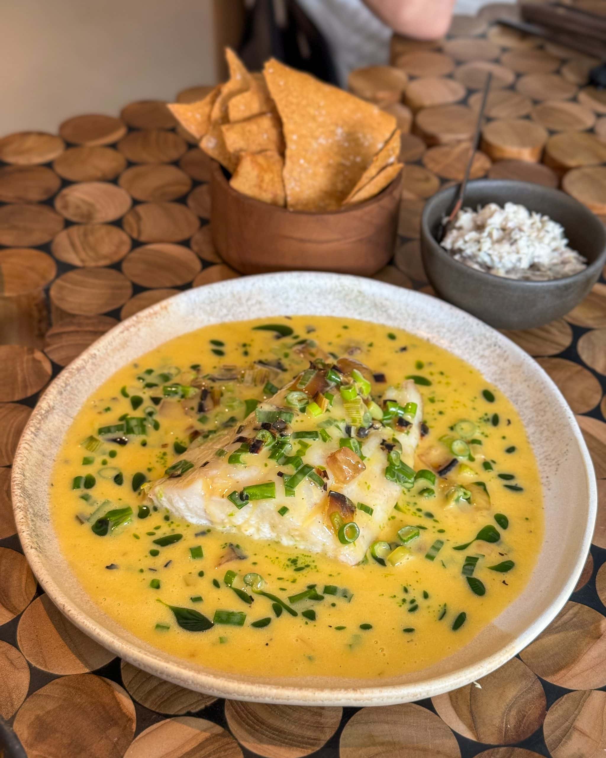 Even the fish bones are used; they are pressure cooked before being mixed with lemongrass and chillies, then pureed with three types of flour, forming a dough that gets made into crispy lavash crackers.