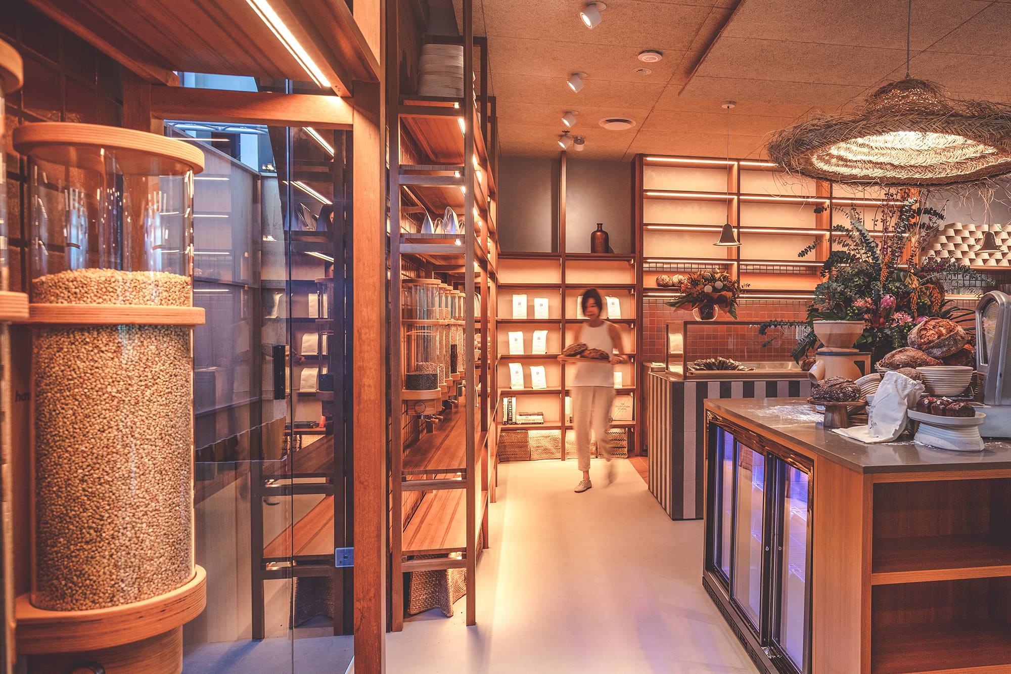 The cafe is equipped with grain silo dispensers, a grain miller, and even a slow-proofing room, where up to 800 loaves of sourdough can be viewed as they mature via a glass window.