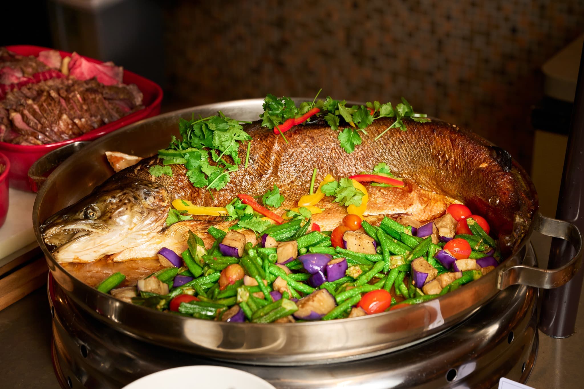 No reliable buffet is complete without the Live Stations serving Yuan Yang Chicken “Money Bag” and Grilled Satay with Condiments, as well as roasted meats like the Slow Roasted Spiced Leg of Lamb and Fortune Oat-crusted Norwegian King Salmon.