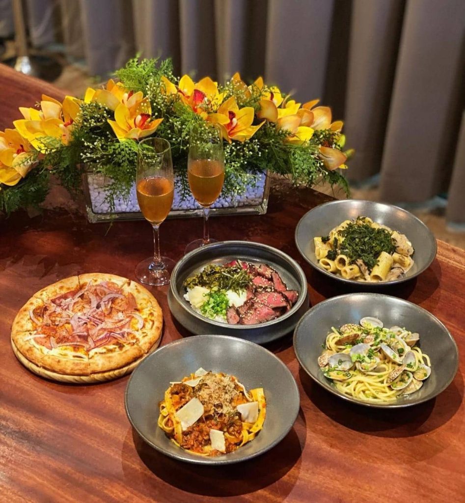 Oishii Ristorante marries Italian and Japanese cuisine, presenting a menu filled with small bites, sharing platters, pizza, pasta, and donburi. Highlights include the Salmon Tartare (S$20), Iberico Secreto Don (S$32), and Truffle Mushroom & Seaweed Rigatoni (S$20).