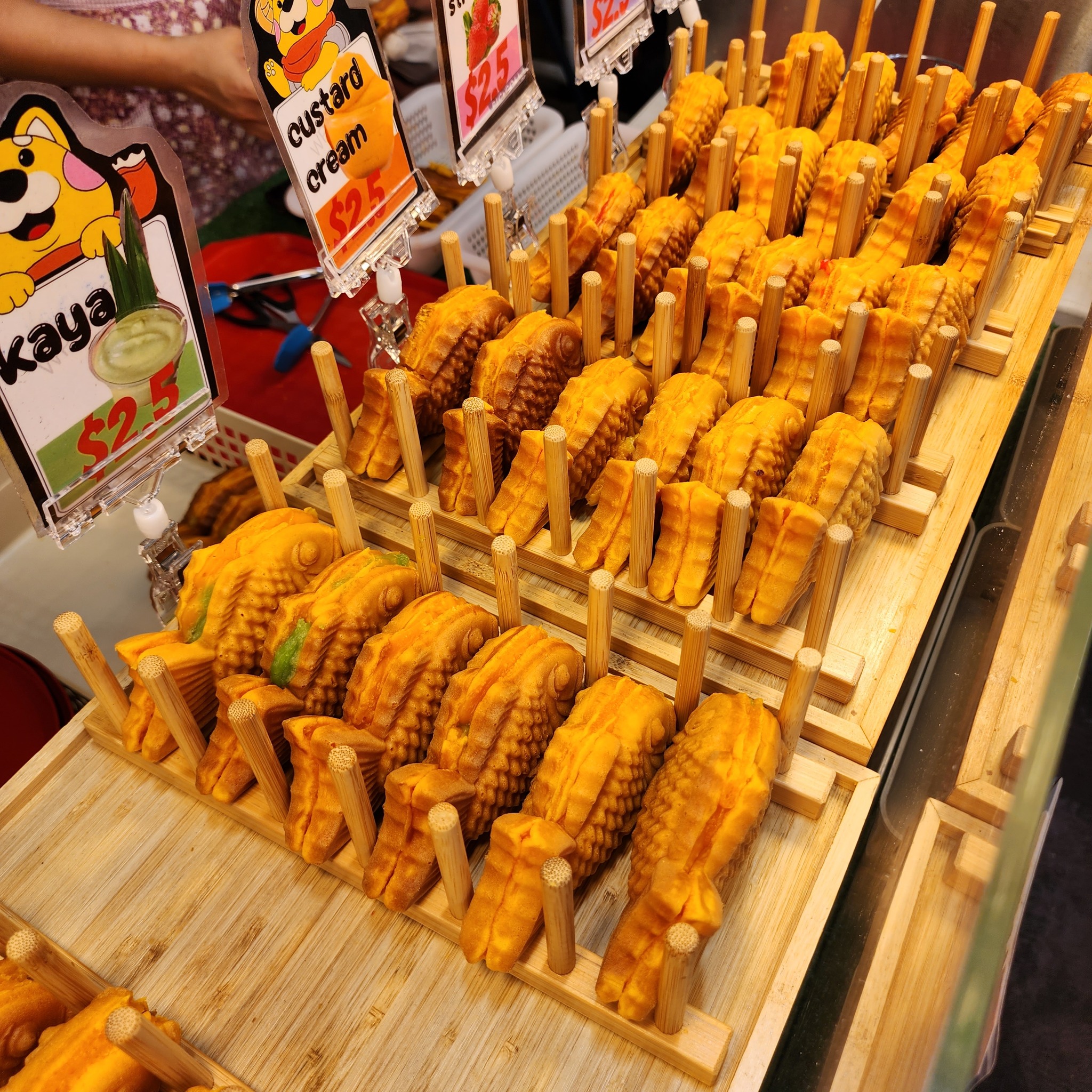 Highlights include Japanese-style taiyaki in fun flavours like taro, strawberry, and Thai tea; honeycomb waffle bowl ice cream; and the unique roast chicken skeleton, a specialty snack from China.