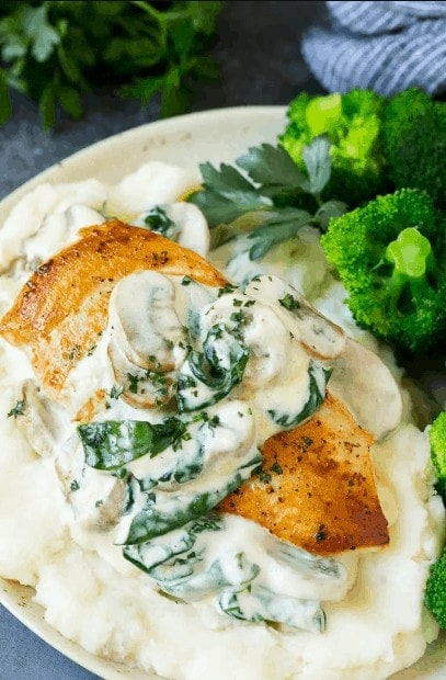 This Italian dish features chicken breasts, sauteed mushrooms and spinach, beautifully accompanied with a decadent white wine cream sauce.