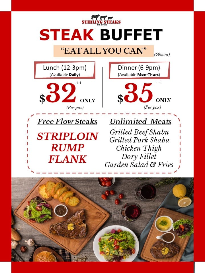 But that’s only if you pay for it a la carte. Big eaters can indulge in all the striploin or rump they want from just S$32++ with Stirling Steaks’ special free-flow Steak Buffet.