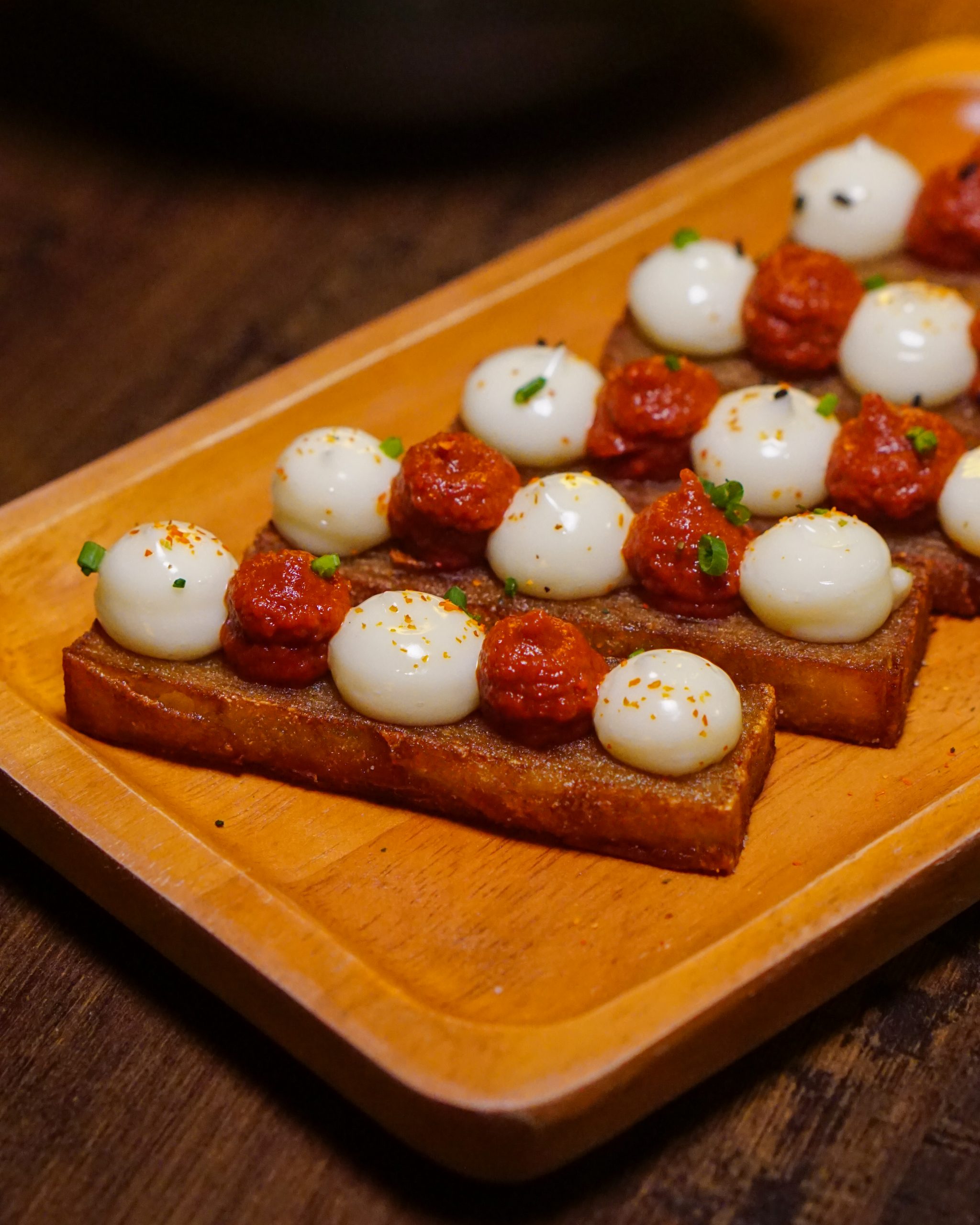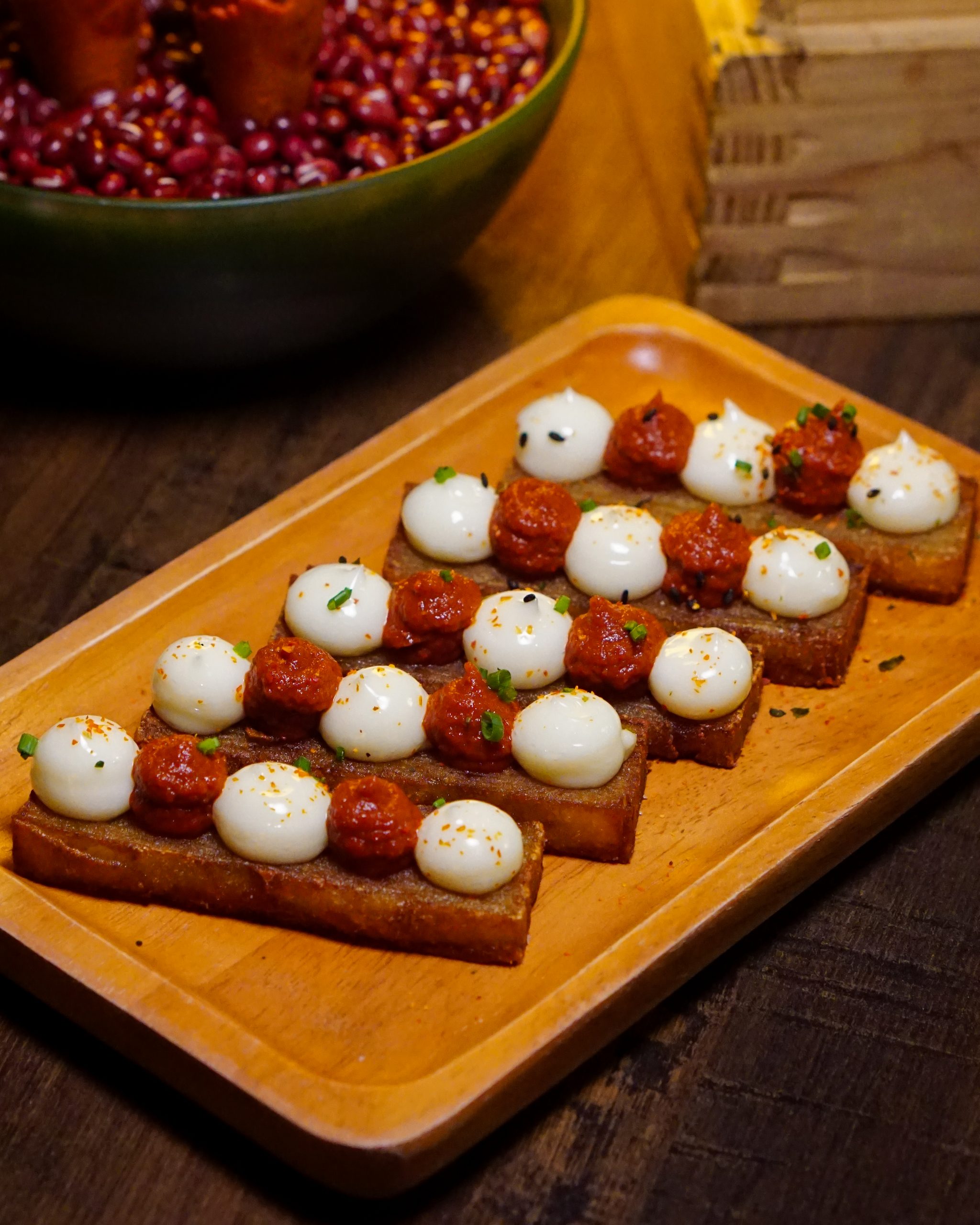 Beurre@23’s refined take on the Spanish tapa features potatoes that have been painstakingly hand-cut, layered, and deep-fried till golden brown, piped with a tangy tomato-based sauce and creamy aioli.