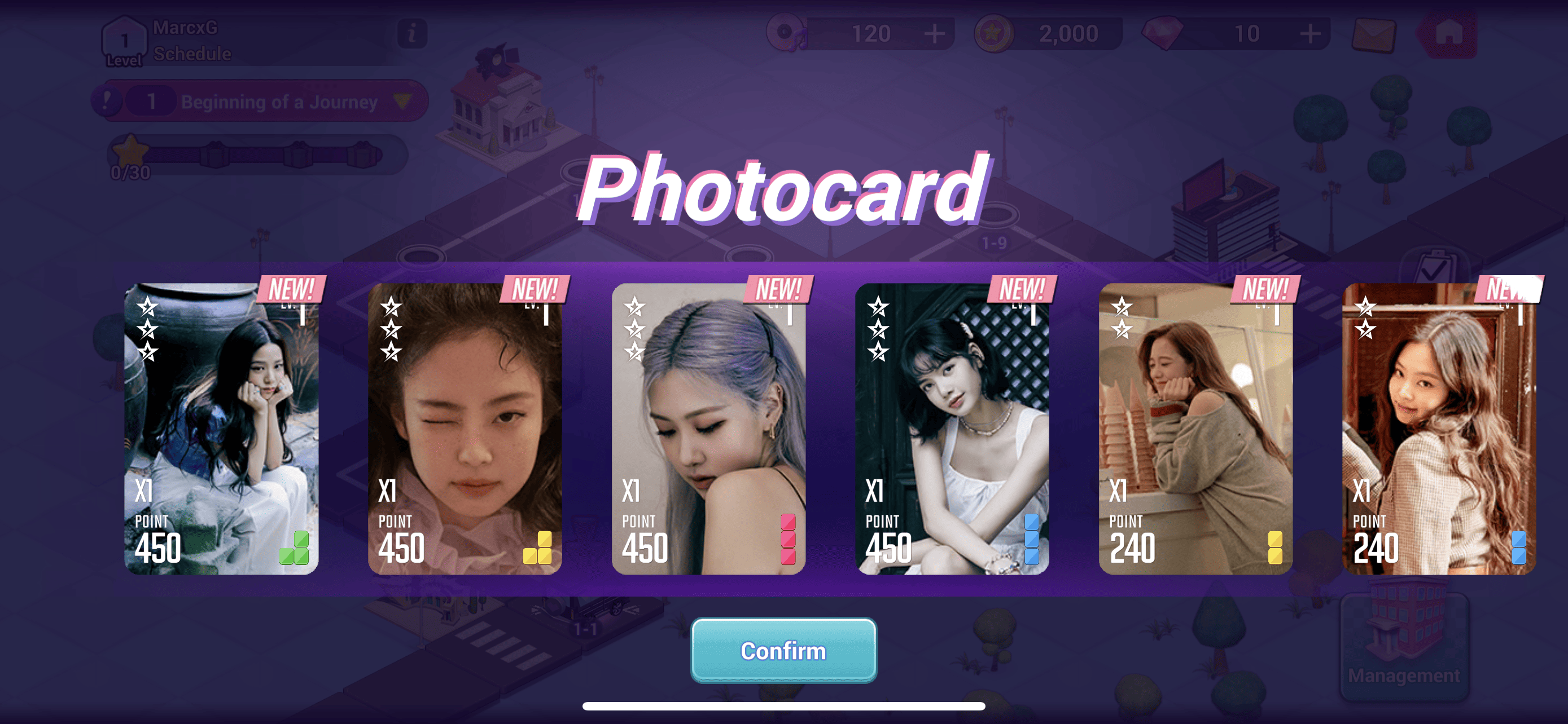 The member’s photocards consist of four different stats in music, acting, fashion, and charm. The four stats will determine how many points you earn when you use the cards. To raise a card’s level, you’ll need a material called stardust which you can collect when you explore the management area.