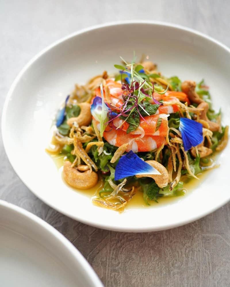 The photogenic dish is a refreshing mix of young winged beans and calamansi, and topped with some bright orange shrimps and blue pea flowers.