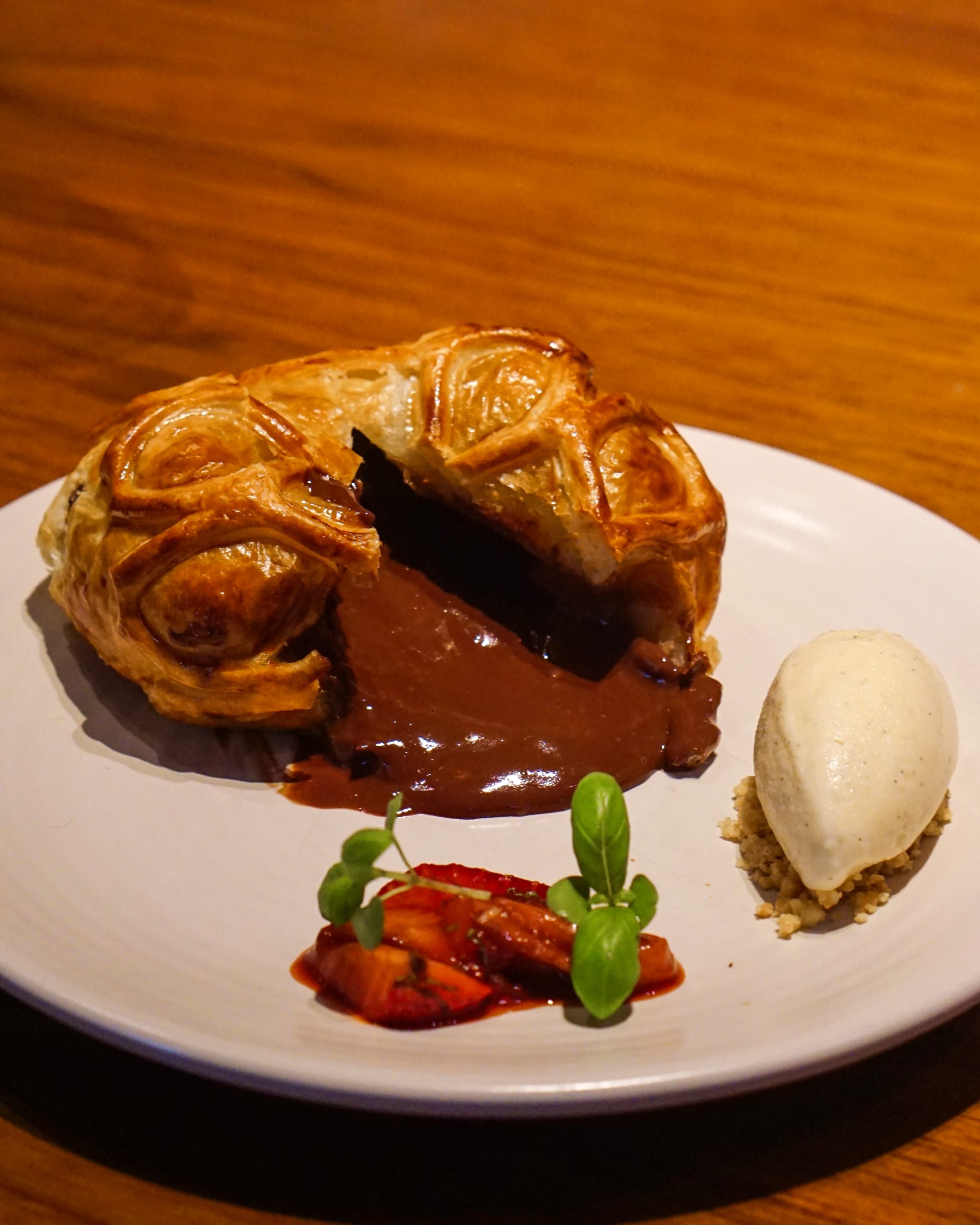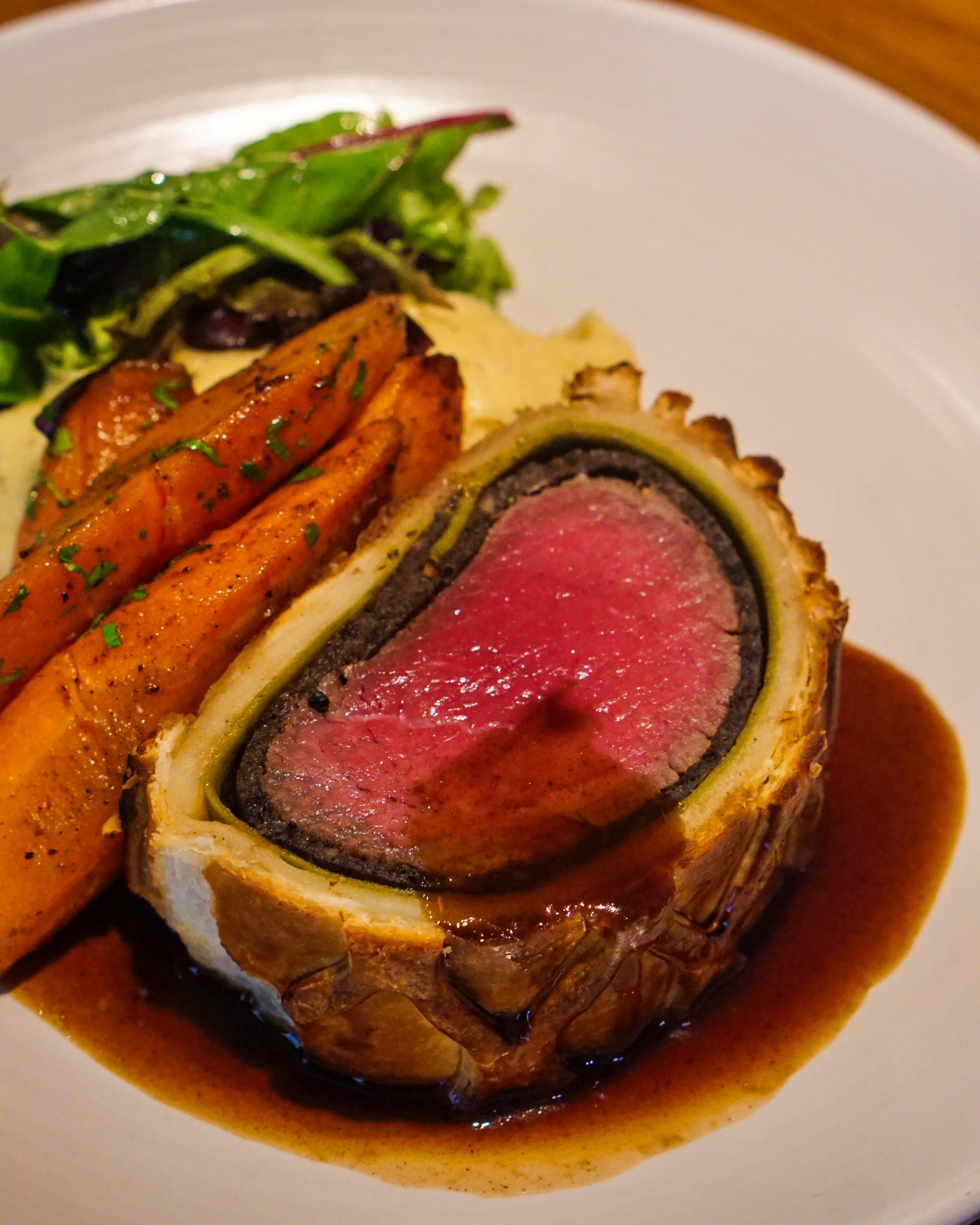 Tender filet mignon cooked to a perfect medium rare encased within golden pastry served alongside creamy mashed potatoes, honey roasted carrots and red wine jus — this was as satisfying as I expected it to be.