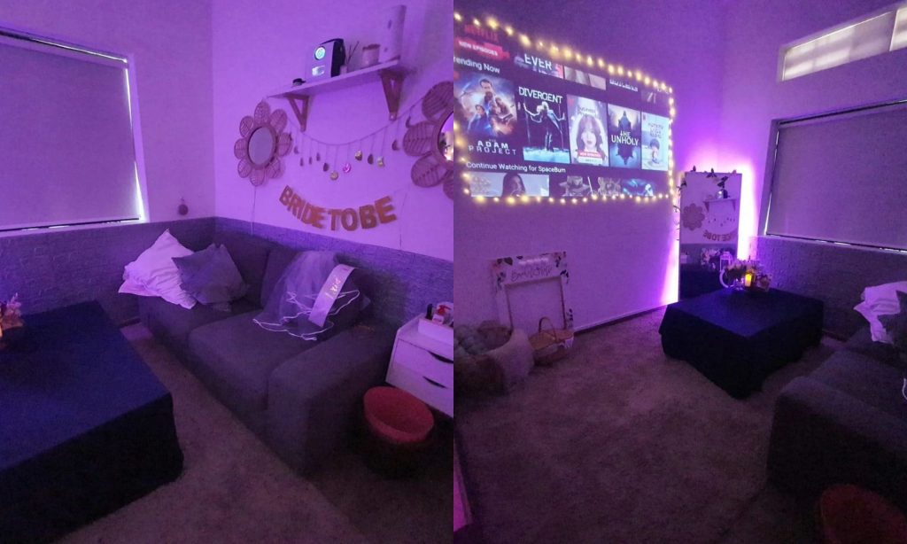 There are two themed rooms to choose from, with the first being SPACEBUM (S$80 for 4 hours, S$100 for 6 hours), which can fit up to 5 pax comfortably. Perfect for movie dates, the cosy and private space is equipped with a projector set-up, a cushy sofa, board games, and halal snacks. Additional items like a ring light, fridge for cake storage, and even prayer mats are also available upon request.