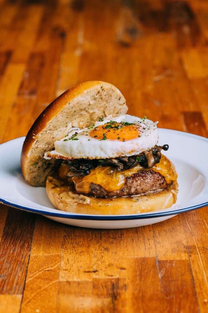 It has caramelised onion butter, sauteed mushrooms, a sunny egg, sitting on top of a thick and juicy Hamburg Au Jus and a nicely melted double cheddar cheese slice. All that deliciousness sandwiched between two lightly toasted bagels — the perfect post-workout meal.
