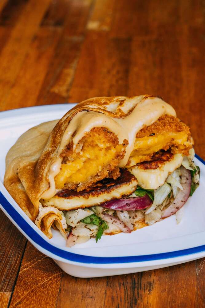 The dish comes with smoked maple butter, fried pumpkin, halloumi, sumac red onion, and garlic aioli — just looking at the ingredients alone is making my tummy growl.