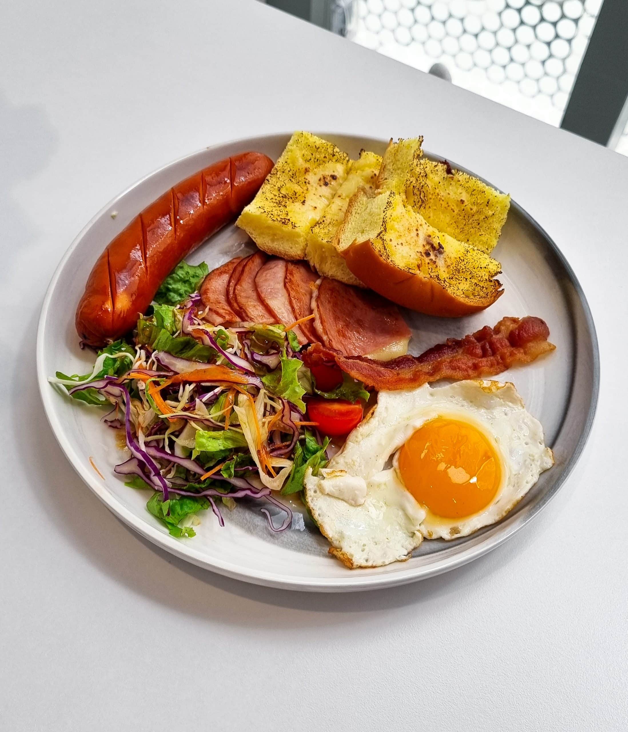 Even though I was tempted by the Japanese Canadian Premium Okonomi Hotdog (S$13.90), an okonomiyaki-inspired hotdog topped with bonito flakes, I eventually went with the Gui Breakfast (S$16.90), consisting of sweet bread with torched cheese, melted ham & cheese, chorizo sausage, bacon, salad, and a sunny side up.