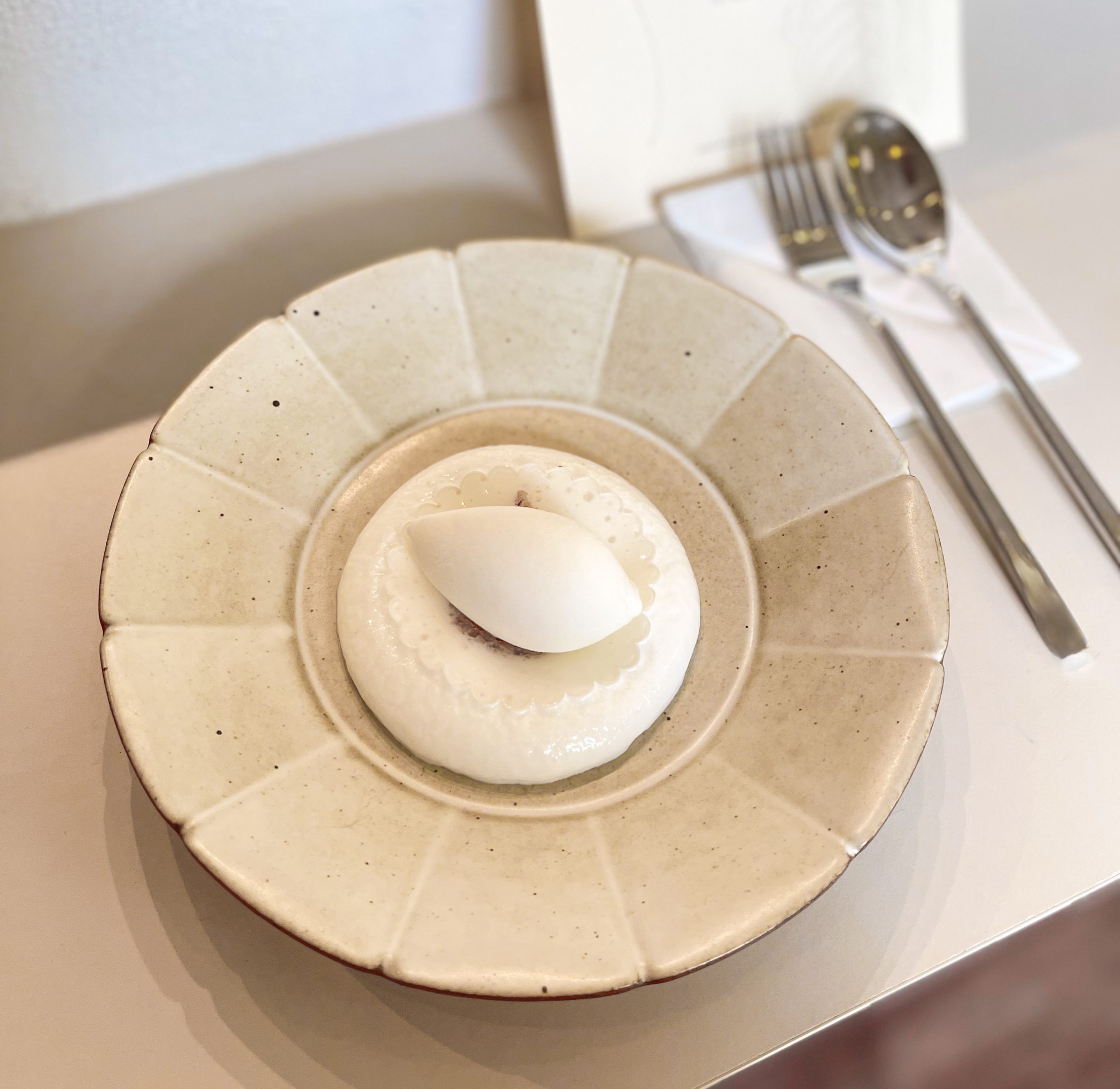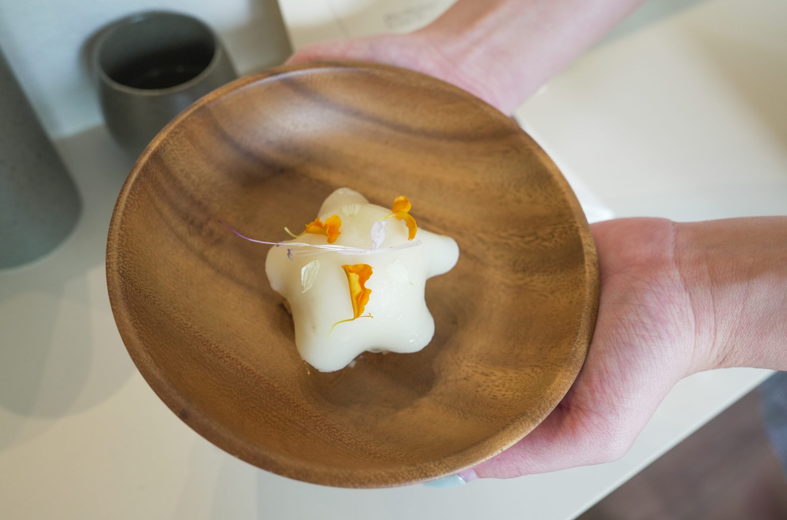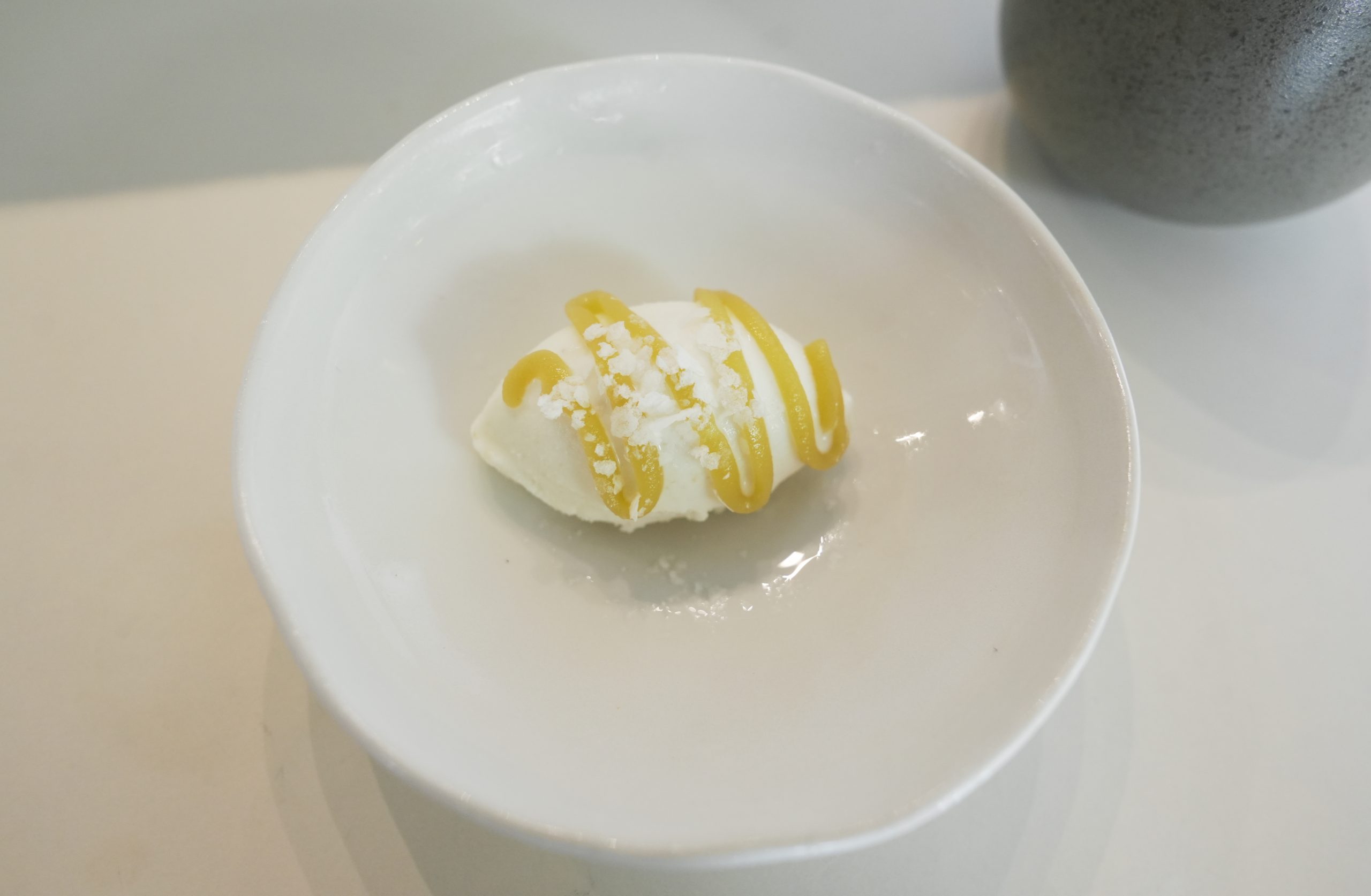 The second course was really interesting to say the least. It features peanut gelato, chewy mochi, and shallot oil — ring any bells? This dessert is inspired by all our childhood favourites, Muah Chee. The mochi is infused with shallot oil which gives the dessert a touch of savouriness and a rich fragrance; a nod to the traditional muah chee that is a rare find in Singapore.