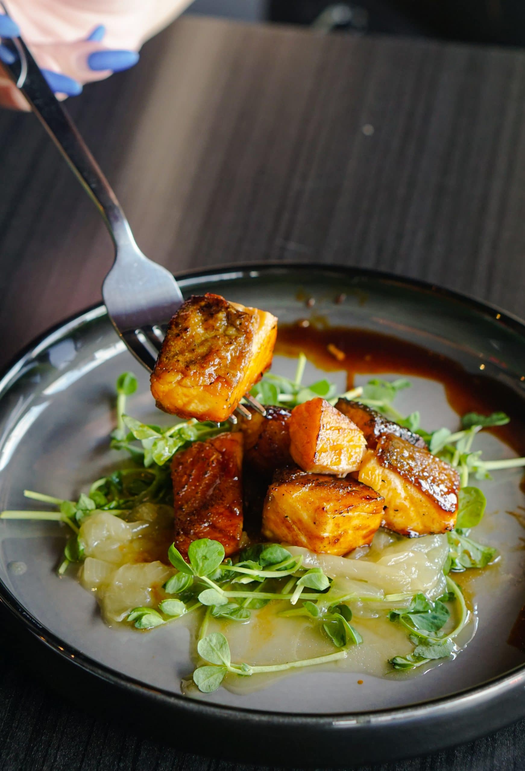 Alternatively, the Salmon Cube Taré (S$14) comprises charred salmon belly nuggets glazed with housemade yakiniku no tare (yakiniku sauce), served alongside snow pea shoots, caramelised onion, and a house bearnaise sauce.
