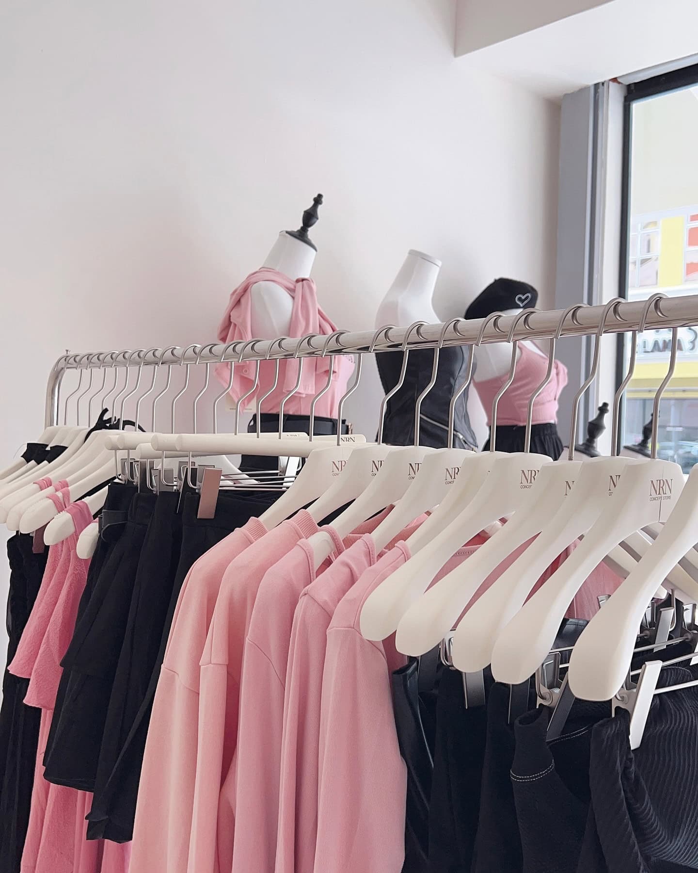 The shop sits on the second and third floors below Hunger Hotpot, with the second-floor catering to more feminine pieces in pink and the third-floor offering items in neutral tones like greys and blacks.