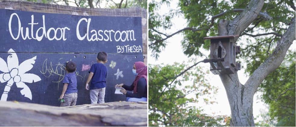 There are various fruit trees planted in the area for children to observe. An old hornbill’s nest with an artificial nest box has also been installed in the Yellow Flame tree.