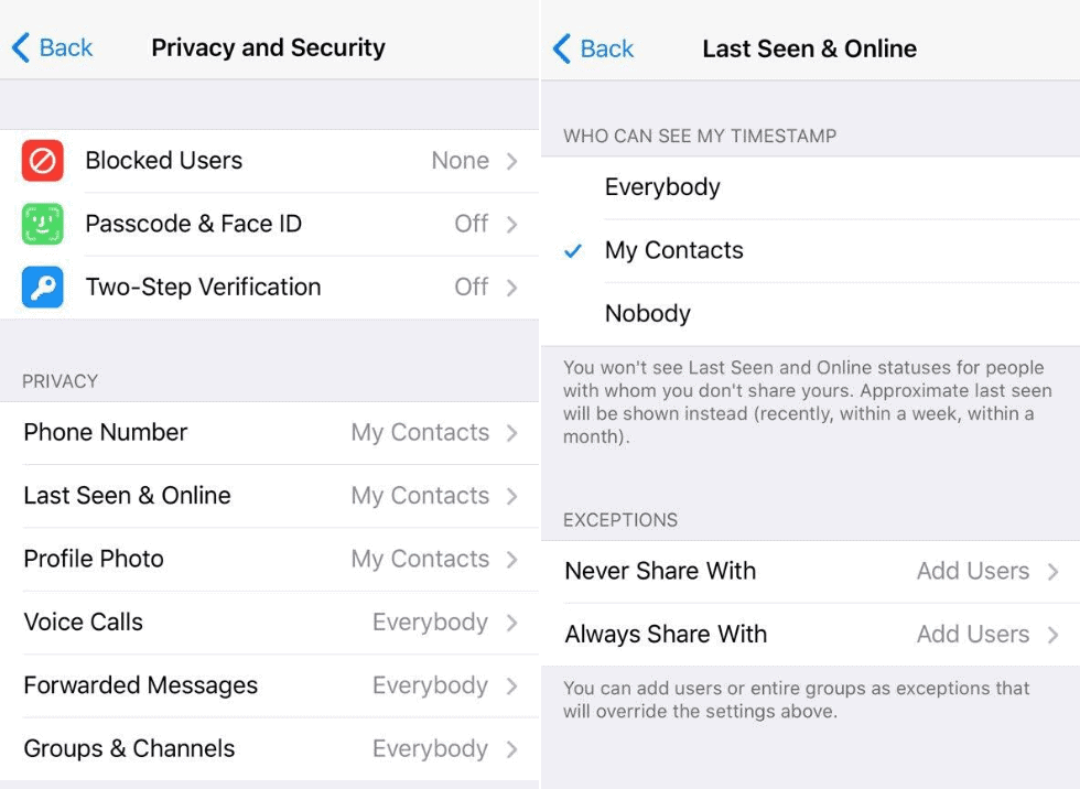 Privacy is everything, but the freedom to customise your privacy settings is always appreciated. Thankfully, Telegram allows you to customise the users that get to see your “last seen” status. To customise your last seen settings, just click on “Settings” > “Privacy and Security” > “Last Seen & Online”. From there, you can choose who gets to see your timestamp and even specify exceptions to this setting.