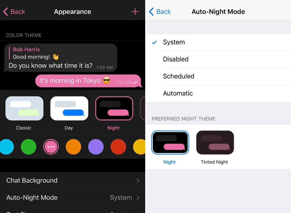 Telegram also has an auto-night mode feature where you can specifically decide whether you want to schedule your night mode functions, or automatically activate it when brightness falls below a certain level (which can be adjusted).