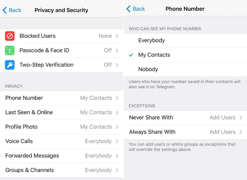 You can choose to show your phone number to everybody or just those in your contacts, or you can also choose not to show your number to anybody. Telegram also allows you to include exceptions where you can choose specific users to hide your number from.