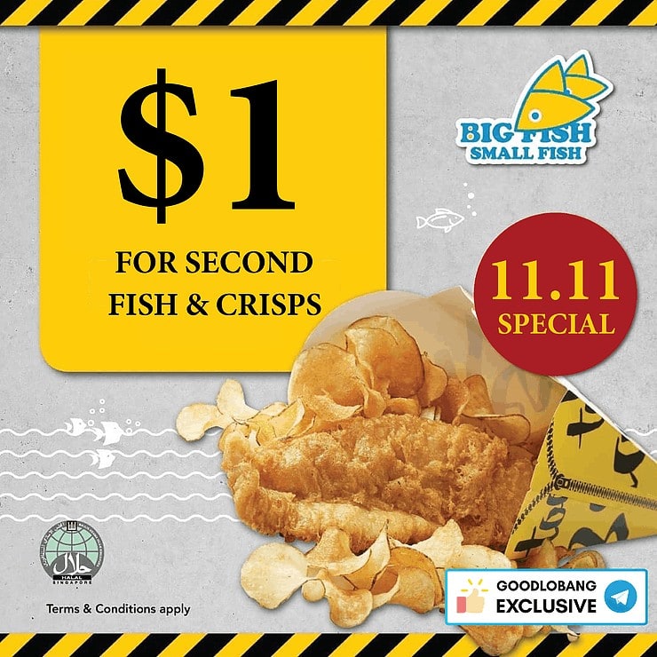 On 11.11, you can get your second Fish & Crisps order at only $1! Sounds fishy? It definitely isn’t! Drag a friend and head to any Big Fish Small Fish outlet to enjoy their delicious delight. Do note that the second fish & crisps has to be of equal or lower value than the first. (A la carte Fish & Crisps only).