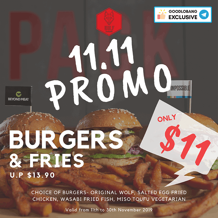 Wolf Burgers are offering their succulent burgers served with yummy large fries at only $11. If you want something unique, try out the Salted Egg Fried Chicken Burger or the Wasabi Fried Fish. Their tender and juicy Original Wolf Burger and Miso Tofu Vegetarian Burgers are also some excellent choices to try.