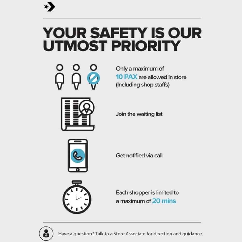 Converse will be implementing measures to ensure safety among customers and staffs in the store. With a maximum of only 10 pax in the store, you would have to join the waiting list and be notified via a call before you can enter the store. Do also take note that you would only get a limited time of 20 minutes to do your shopping.