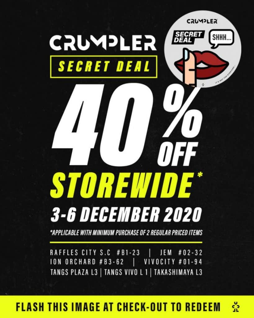 Crumpler Singapore will be having a secret deal of 40% off storewide from 3 December to 6 December 2020 (Thursday – Sunday)! There will be no deal signage in-store and you will have to redeem the offer by flashing the image below during check out.