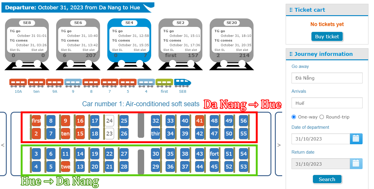 If you’re taking the train from Da Nang to Hue, grab a seat from rows 1 and 2 as shown in the picture below. If you’re travelling from Hue to Da Nang, book a seat from rows 3 and 4.