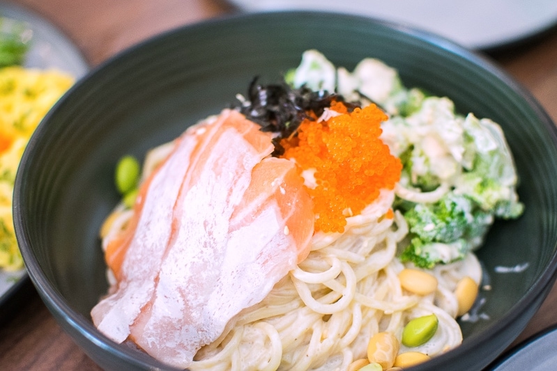 Thick slices of salmon belly and tobiko sit atop cream-tossed spaghetti in the Cold Salmon Cream Pasta (S$22) which turned out to be a lot less cloying, or jelak, as expected.
