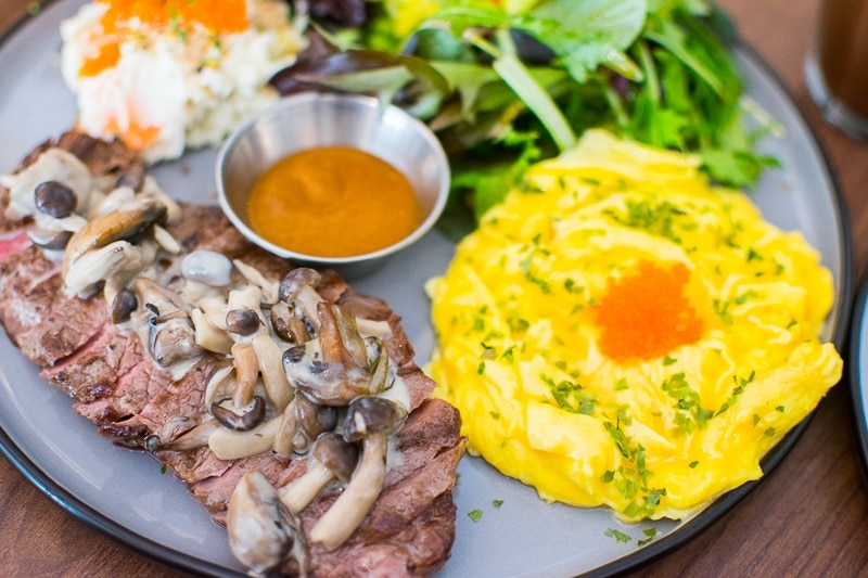 A special take on steak and eggs, this iteration — Steak and Scrambled (S$26) — presents pan-seared beef striploin topped with creamy mushrooms, fluffy scrambled eggs, a delicious potato salad, tobiko, and mixed greens.