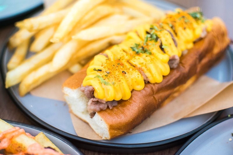 The Philly Cheesesteak Roll (S$18) is a brioche roll that’s stuffed with beef shabu, topped with fried onions, cheese sauce, and is served with fries on the side.