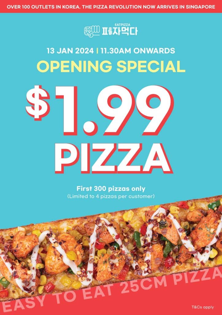 Eager to get your hands on these pizzas? To commemorate its grand opening, Eat Pizza is offering its signature pizzas for just S$1.99 each (U.P S$7.90) for one day only, on 13 January 2024.