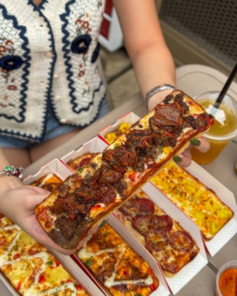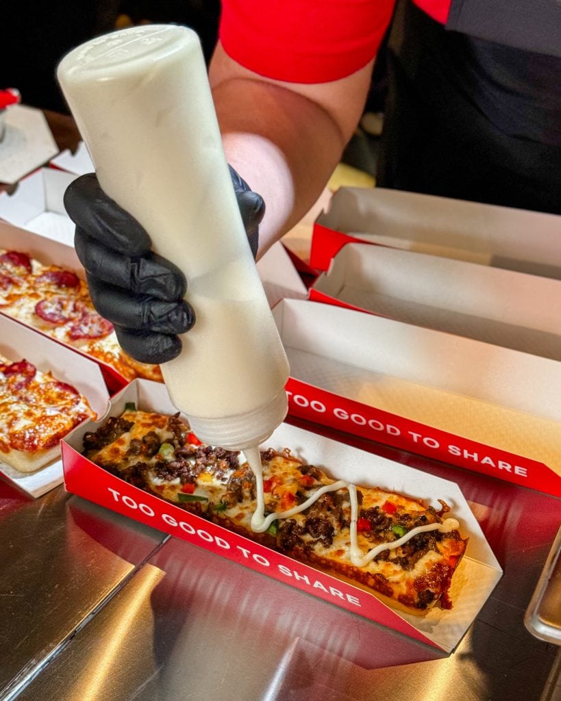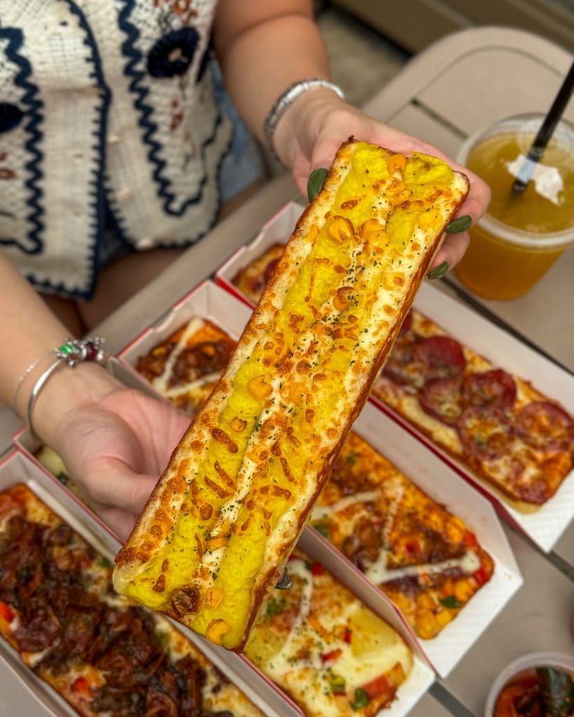 Not only are the pizzas speedy, convenient and tasty, they are also designed to be eaten on the go, as they come in a long rectangular shape measuring 25cm. This makes each pizza, which is served in portions designed for one person, really easy to eat with one hand.