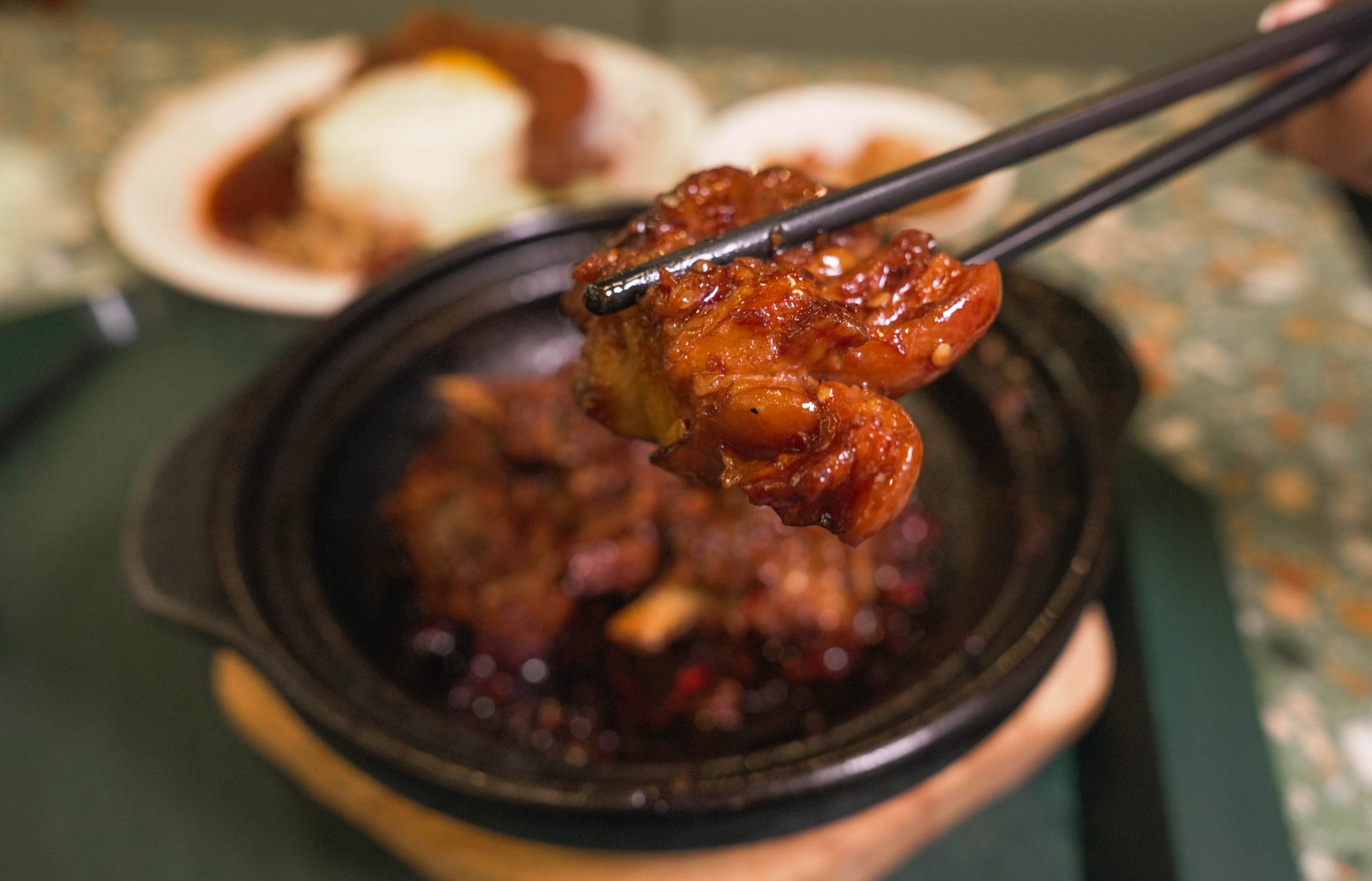 Kam Heong’s Singature Set (S$9.80) include sweet and salty pickled vegetables, braised egg and beancurd (tau kwa) — enjoyed atop steaming hot rice infused with the subtle flavour of pandan. The Pork Knuckle (S$10.80) also comes highly recommended by the chef.