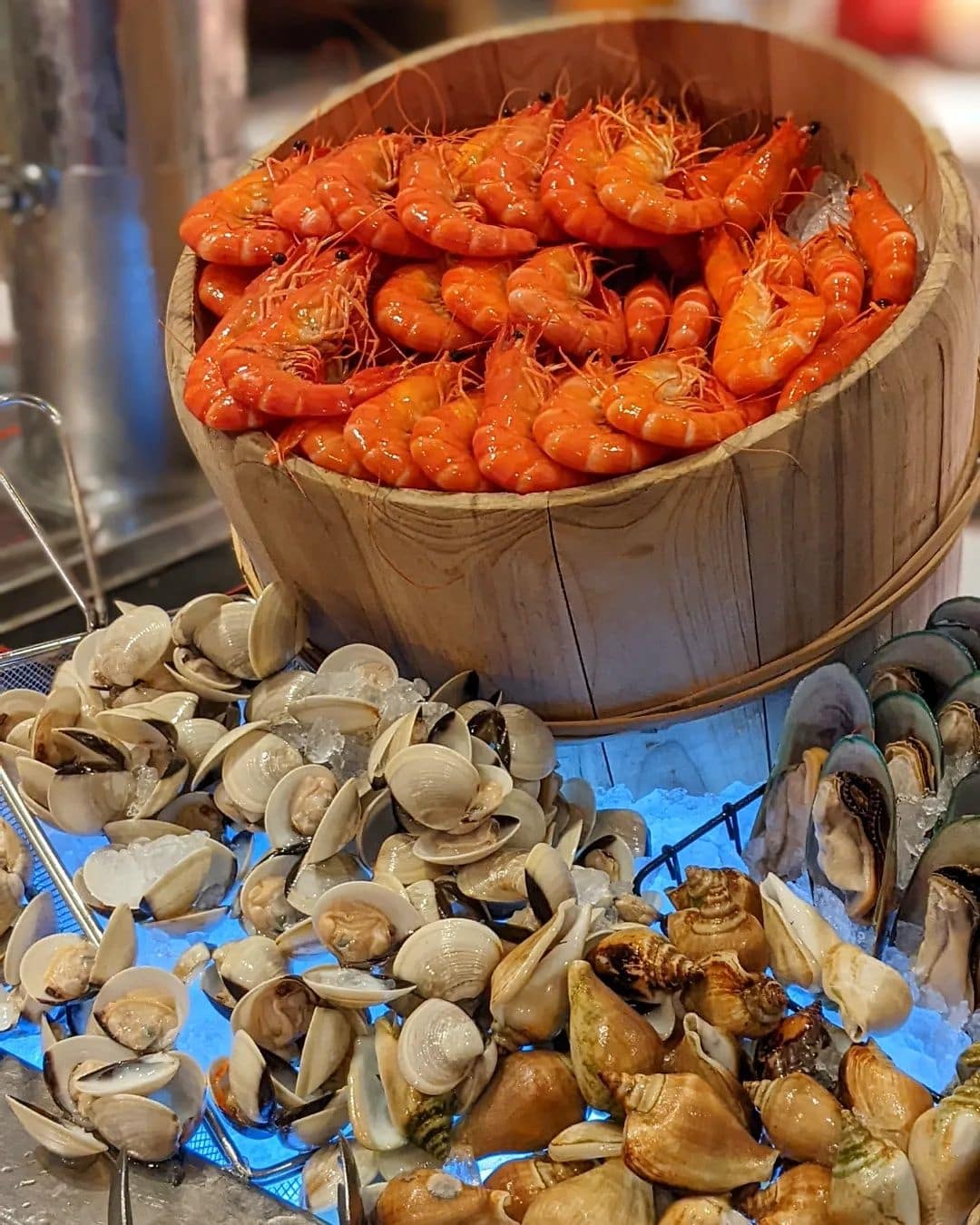 Think freshly grilled Korean-style Marinated Chicken, Scallops, and Garlic Butter Tiger Prawns — delish!