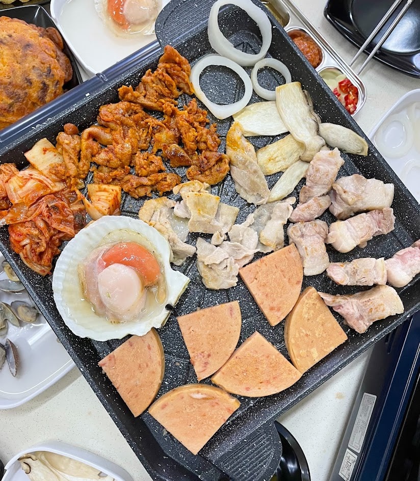 It’s a self-service buffet (no waiting needed), so simply help yourself to the ingredients and enjoy them on the grill and/or in a pot of bubbling army stew.