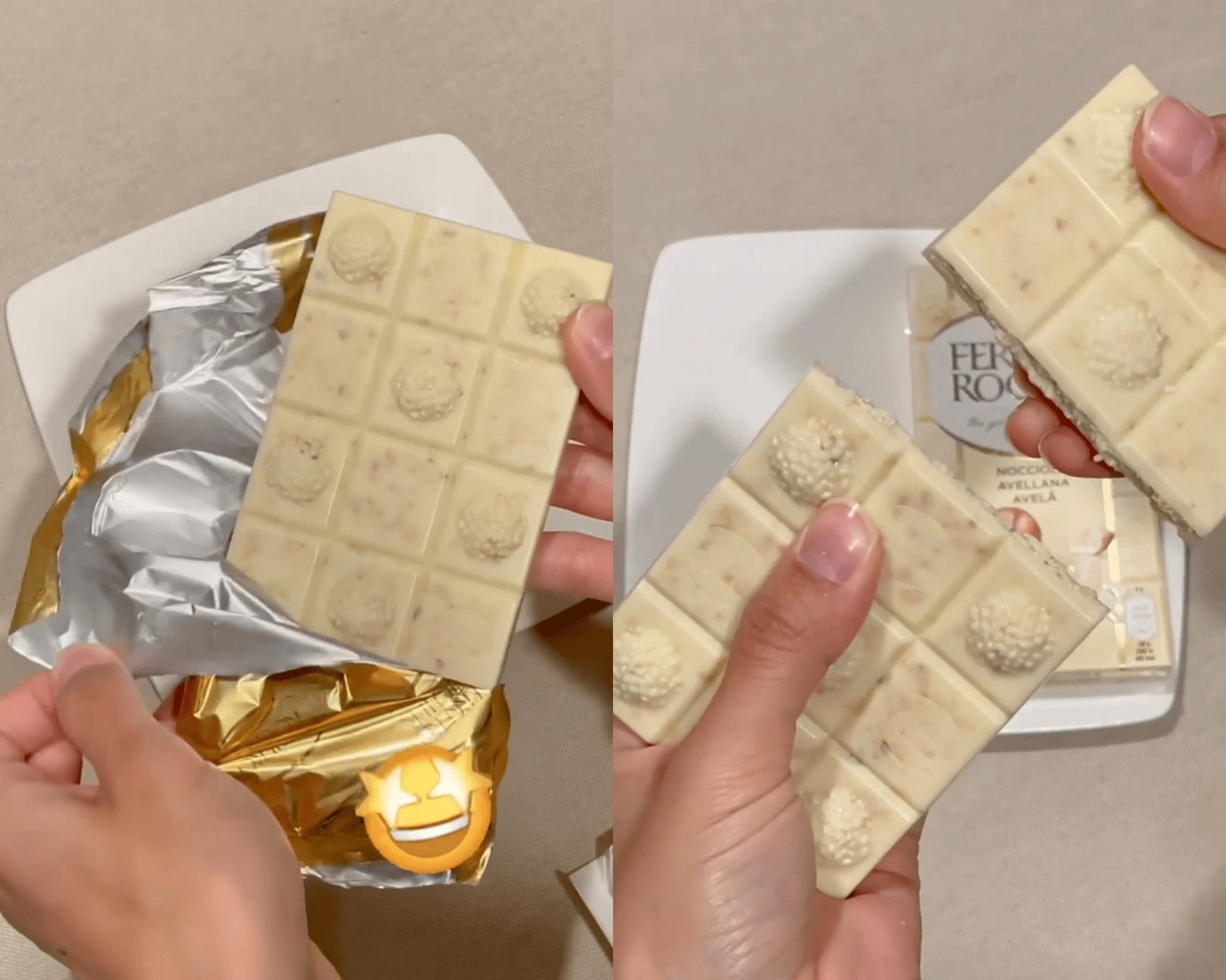 The flavours of everyone’s favourite festive confection remain. Every rectangular bar is filled with crunchy hazelnut pieces and an exquisite creamy filling. Even the spherical shapes, oddly reminiscent of rambutans, are present in alternating squares of chocolate. The only element it lacks is the thin wafer shell.