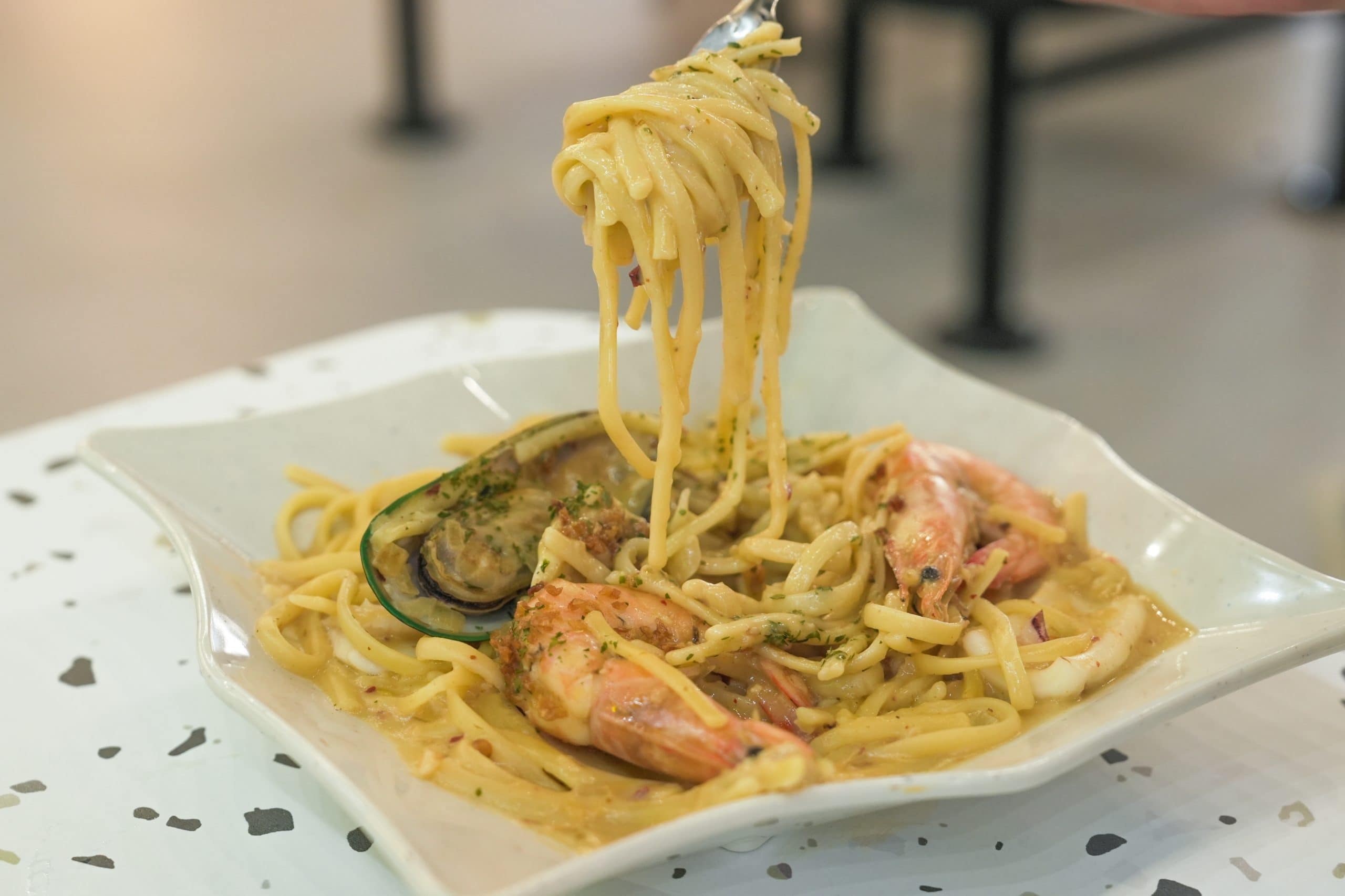 Food Haus’ resident Western stall, Hola, doles out comforting classics like Chicken Chop (S$6.50) and Fish & Chips (S$6.90), alongside breakfast staples like Rosti (S$6.80), Pancake (S$6.80), and American Breakfast (S$8.80). The signature is, however, pasta, with ingredients and sauces you can mix and match.