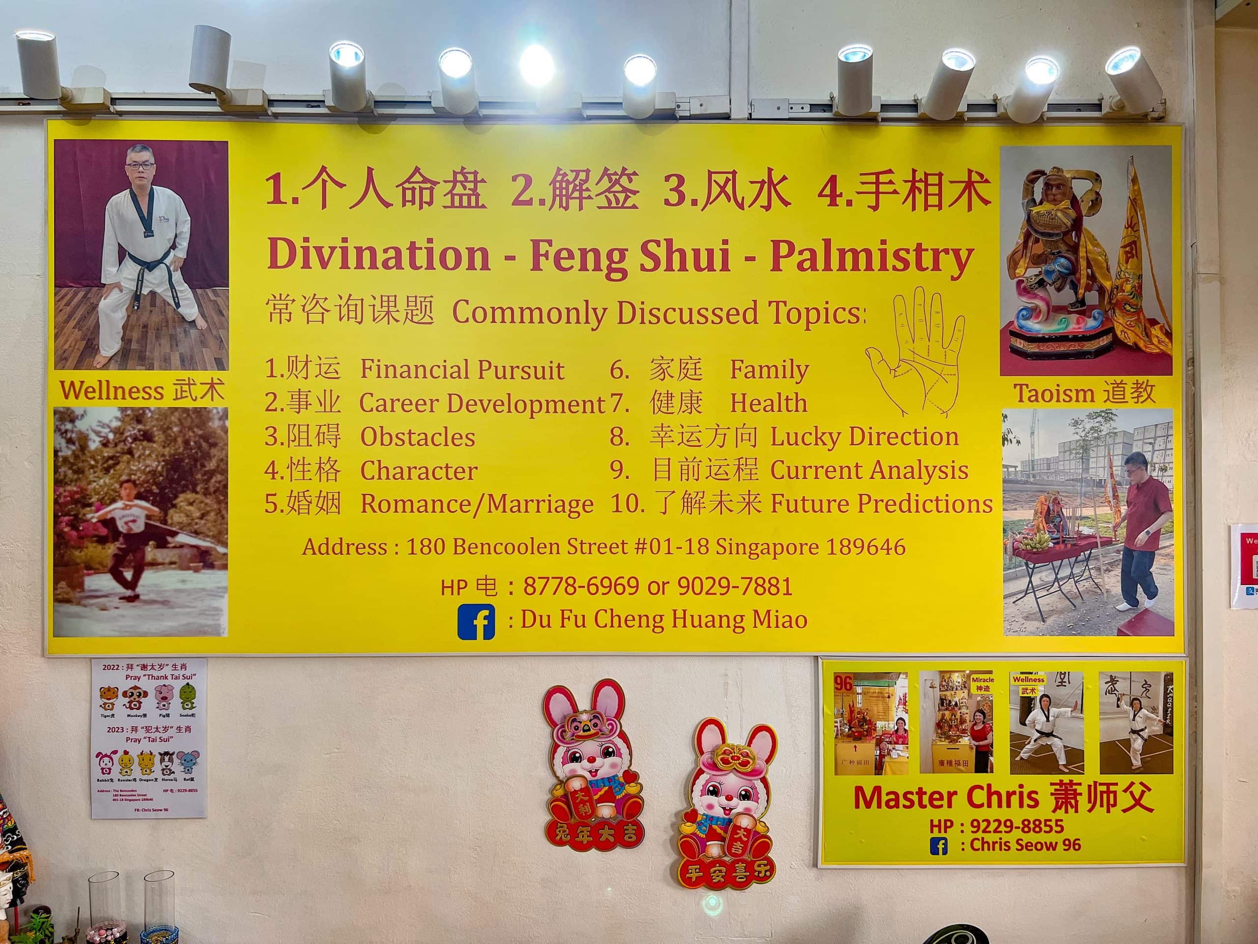Located at The Bencoolen, this temple offers all kinds of fortune telling services — face reading, palmistry, divination, and more. I didn’t express any preference for which master I’d like to see, so I was able to get in pretty quickly.