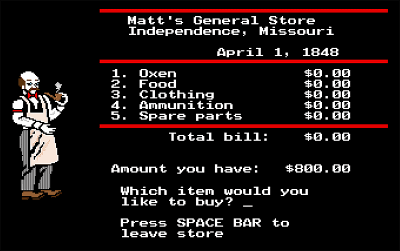 The Oregon Trail is an older, very popular computer game developed back in 1971. You get to play the role of a wagon leader and guide your group of chosen settlers on a journey, where you have to strategically purchase items, hunt for food, and map out your route.