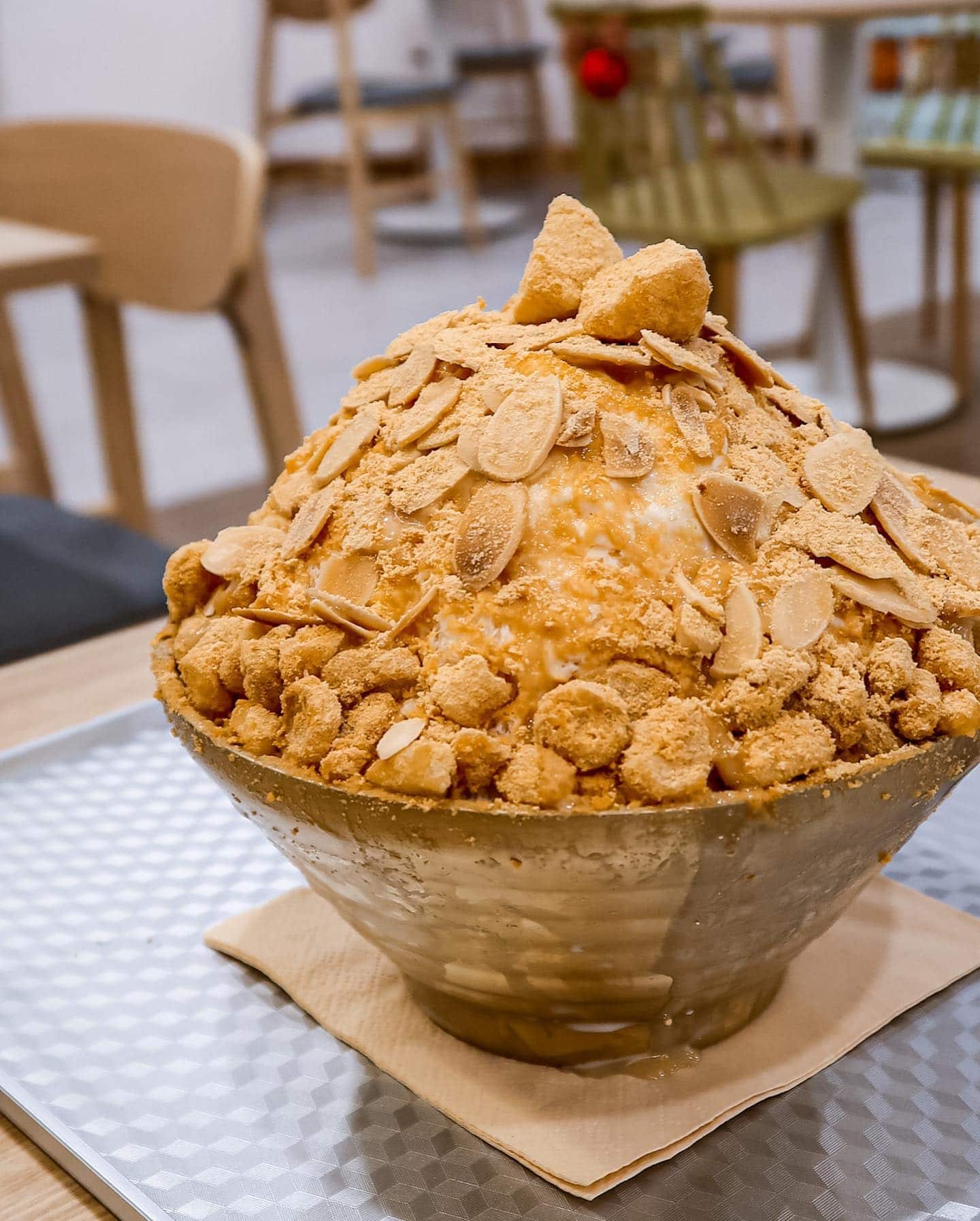 You can’t go wrong with the classic Injeolmi (from S$12.90), milky shaved ice topped with mini Korean rice cakes (tteok), roasted soybean powder and sliced almonds, served with a side of condensed milk. Sweet and nutty goodness!