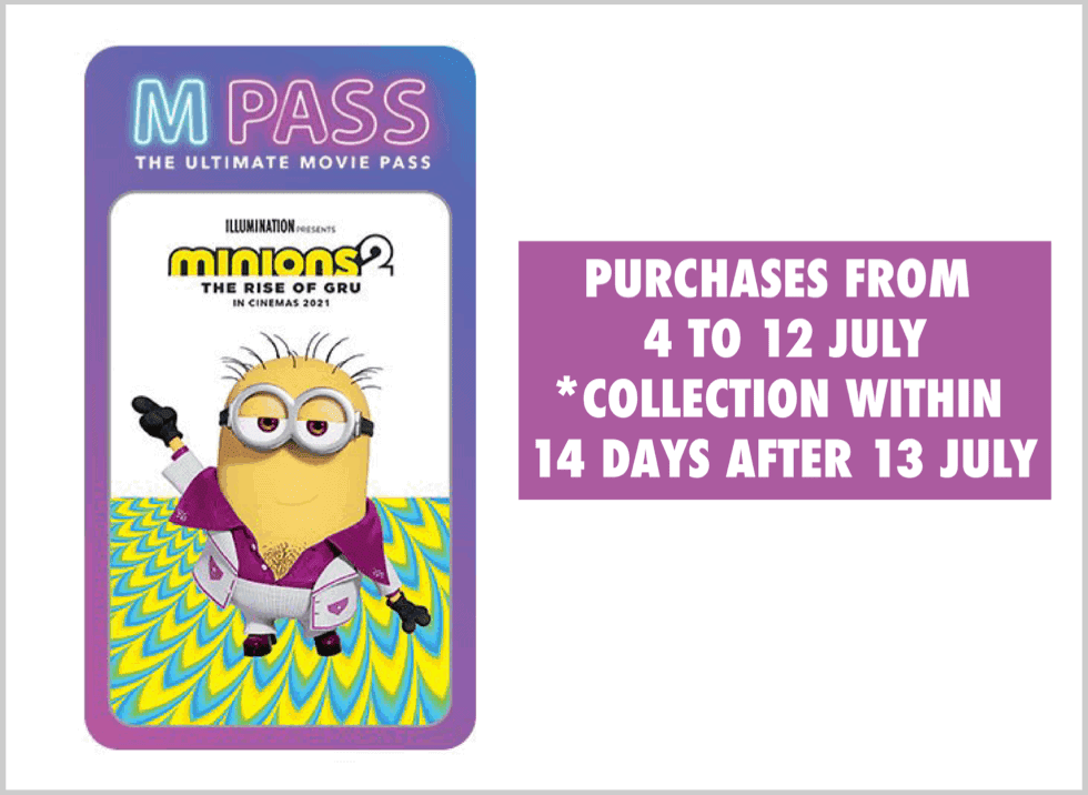 Receive a FREE exclusive collectible Minions movie card when you purchase the Movie Pass from 4th to 12th July. Note that the movie card will only be available for collection within 14 days after cinemas reopen and is available at: