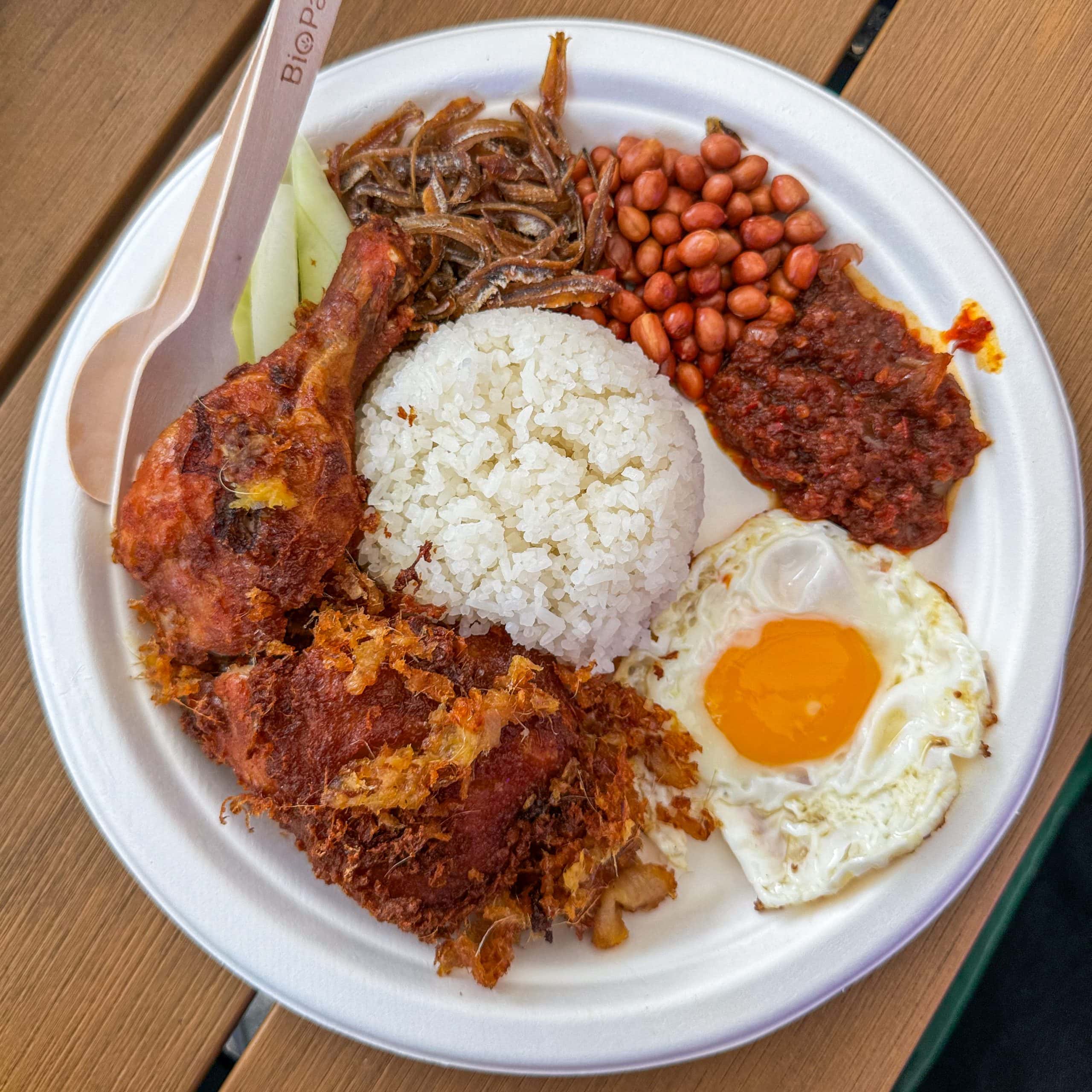You get a generous portion of spiced fried boneless chicken leg — we were served a thigh and drumstick during our visit — with cucumber, anchovies, peanuts, sambal, and a fried egg with a oozy yolk. I especially loved the crispy skin (plus the bits of batter) and the fiery, more savoury-than-sweet sambal. Shiok.