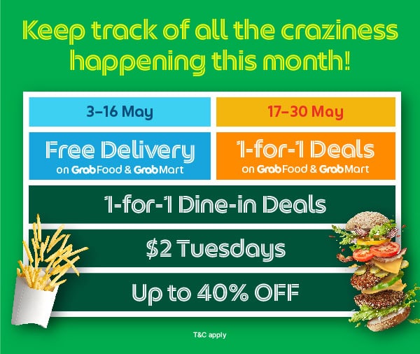 Good ol’ Grab will be running a mega Crazy Rich Savings sale with an incredible array of deals on GrabFood, GrabMart, and even GrabFood Dine-in for an entire month, all the way till 30 May 2024.
